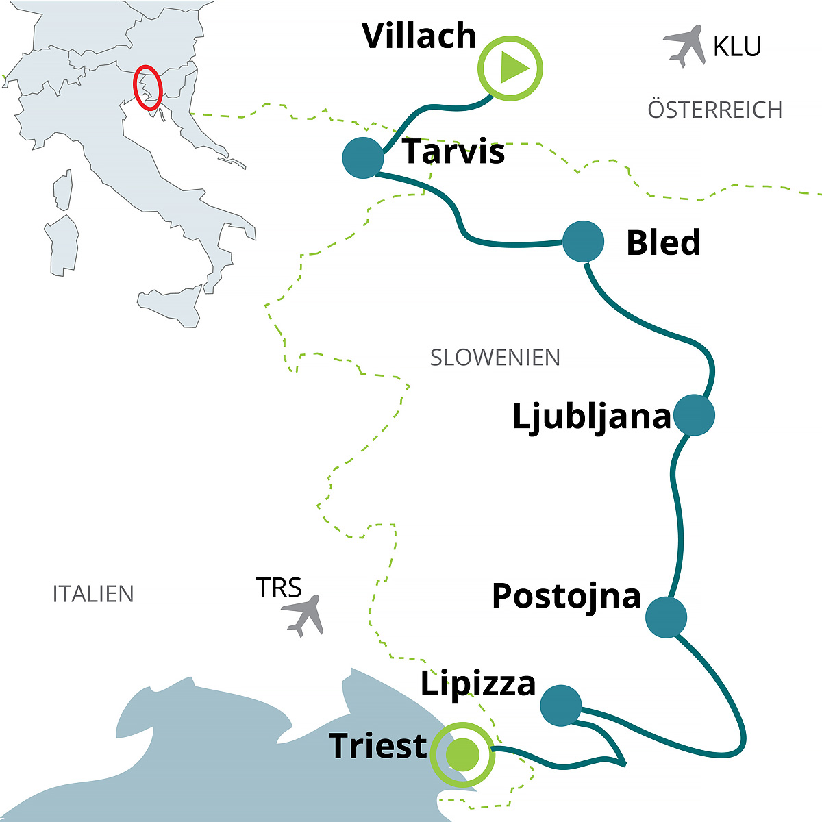 Cyklostezka Alpe Adria, která prochází Slovinskem, má určitě co nabídnout. Kromě nádherné přírody, jezer a hor nabízí možnost navštívit také řadu zajímavých měst. Na této cestě z hor k moři poznáte Villach, Tarvisio, Bled, Lublaň, Postojnu, Lipicu a Terst. Nedříve zavítáte do Tarvisia, italského pohraničního města, poté pojedete směrem na Slovinsko, kde strávíte první noc u pohádkového jezera Bled na úpatí Julských Alp. Objevíte také světoznámé krápníkové jeskyně Postojna a vesnici Lipicu, vyhlášenou chovem jezdecko-kočárových koní lipicánů již od 16. století. Poslední den pojedete na kole směrem k bývalému habsburskému přístavnímu městu Terst.