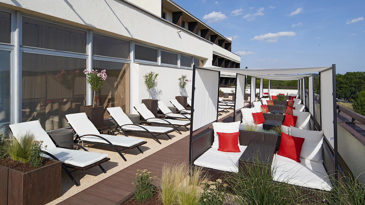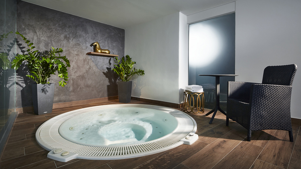 bazén s protiproudem a lehátky, finská sauna, pára, medová sauna, aroma sauna, ochlazovací bazének, relaxační místnost; cvičební sál, privátní vířivka*, fitness, masáže*, relax beach zóna s venkovním bazénkem s plážovými postelemi a lehátky;