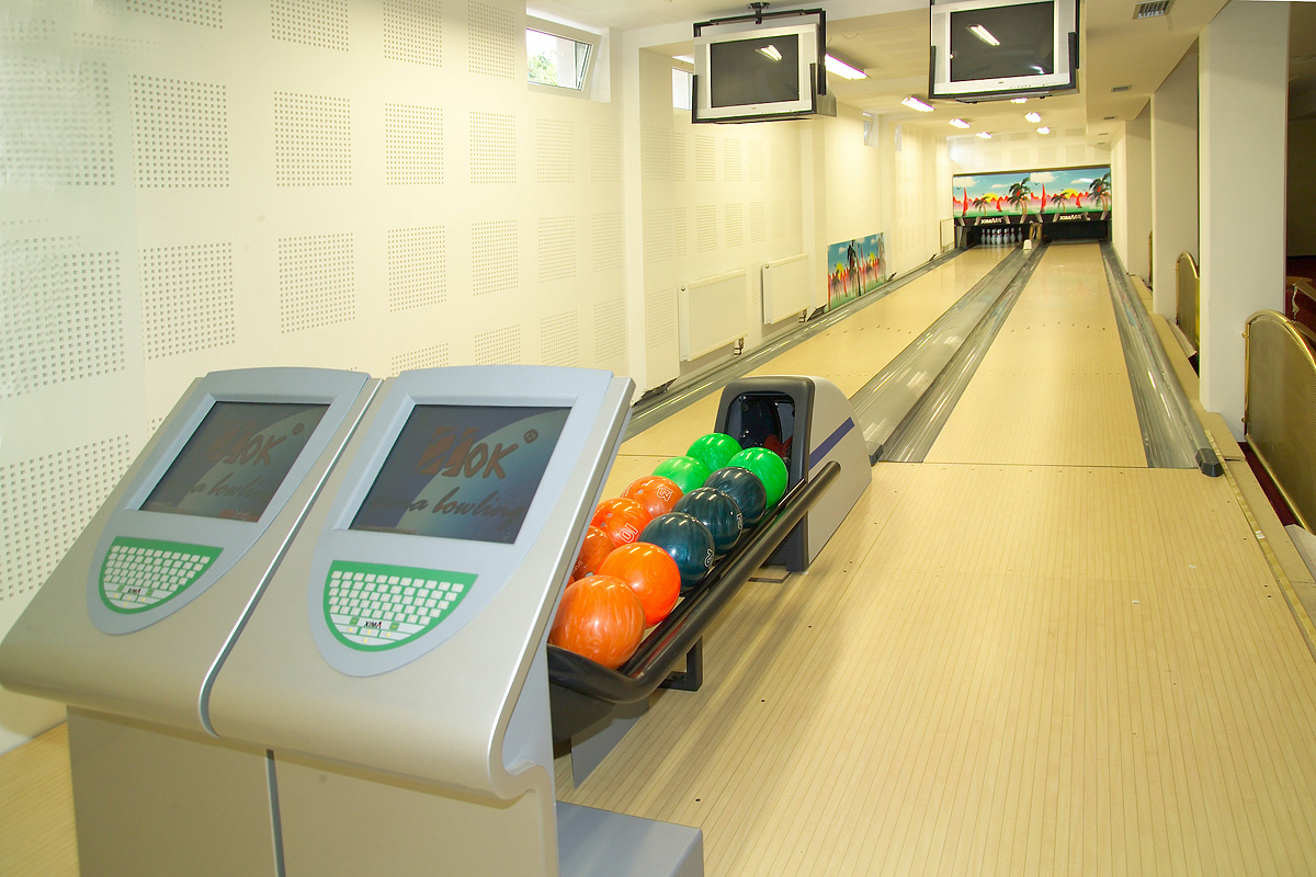 bazén s vířivkou a chrličem, sauna*, relaxační koutek s lehátky, masáže*; 2x bowling*, biliár*, stolní fotbal*