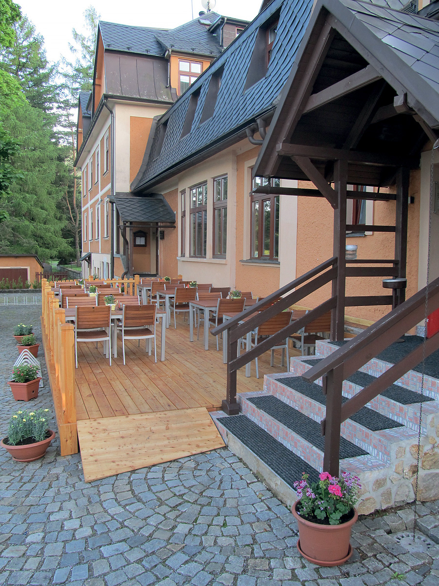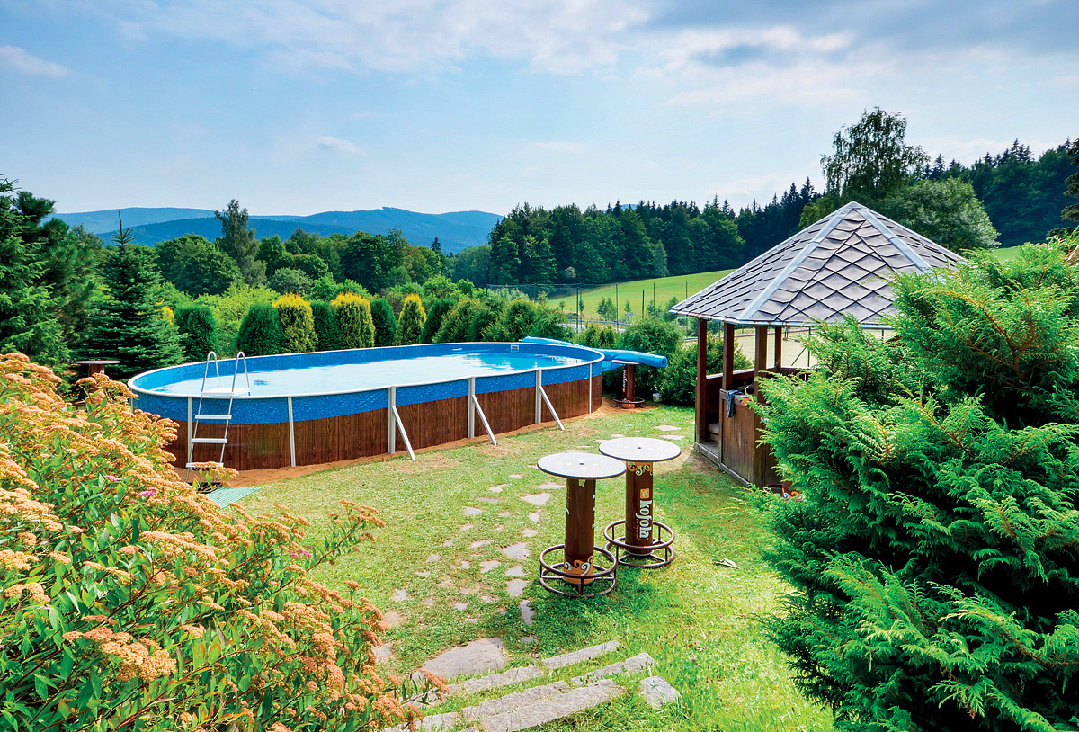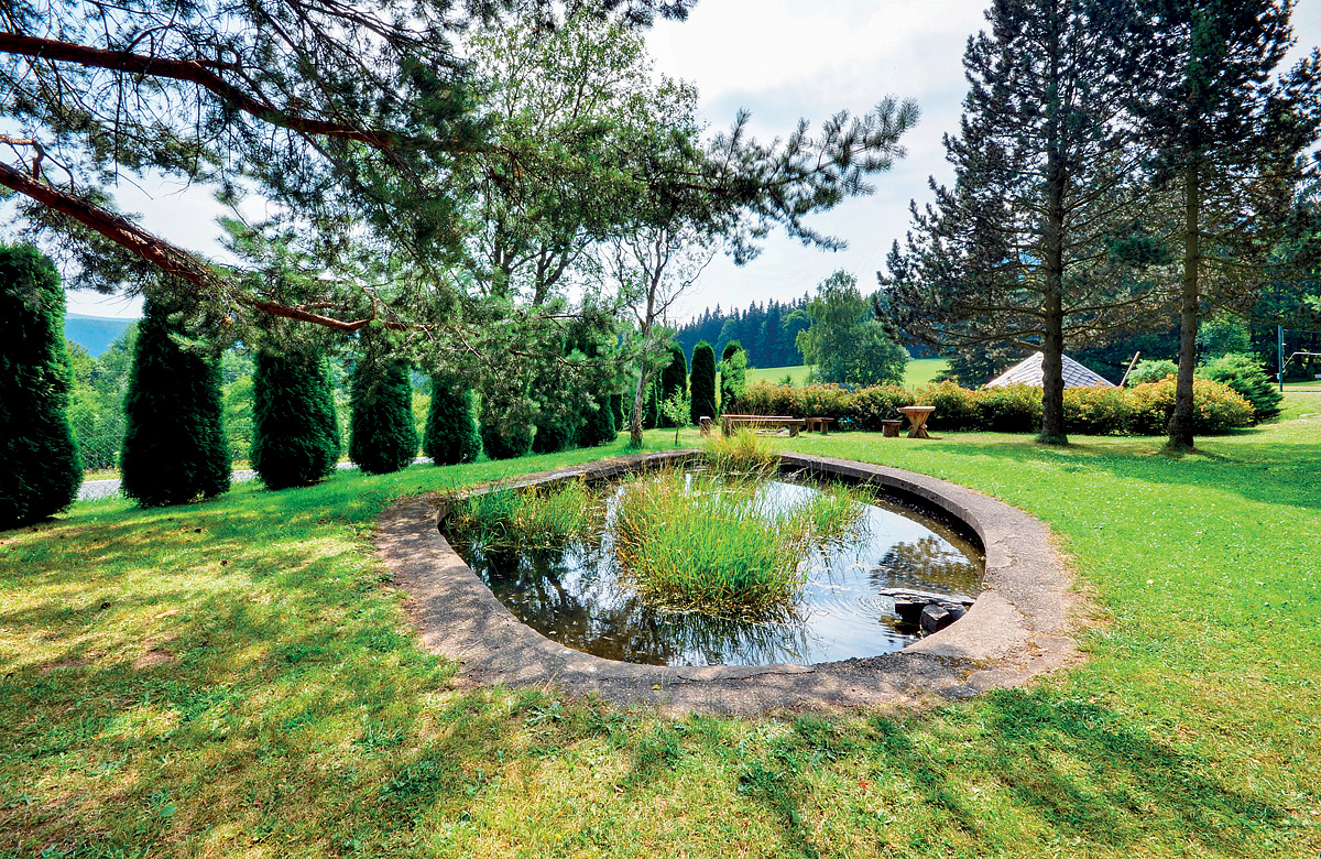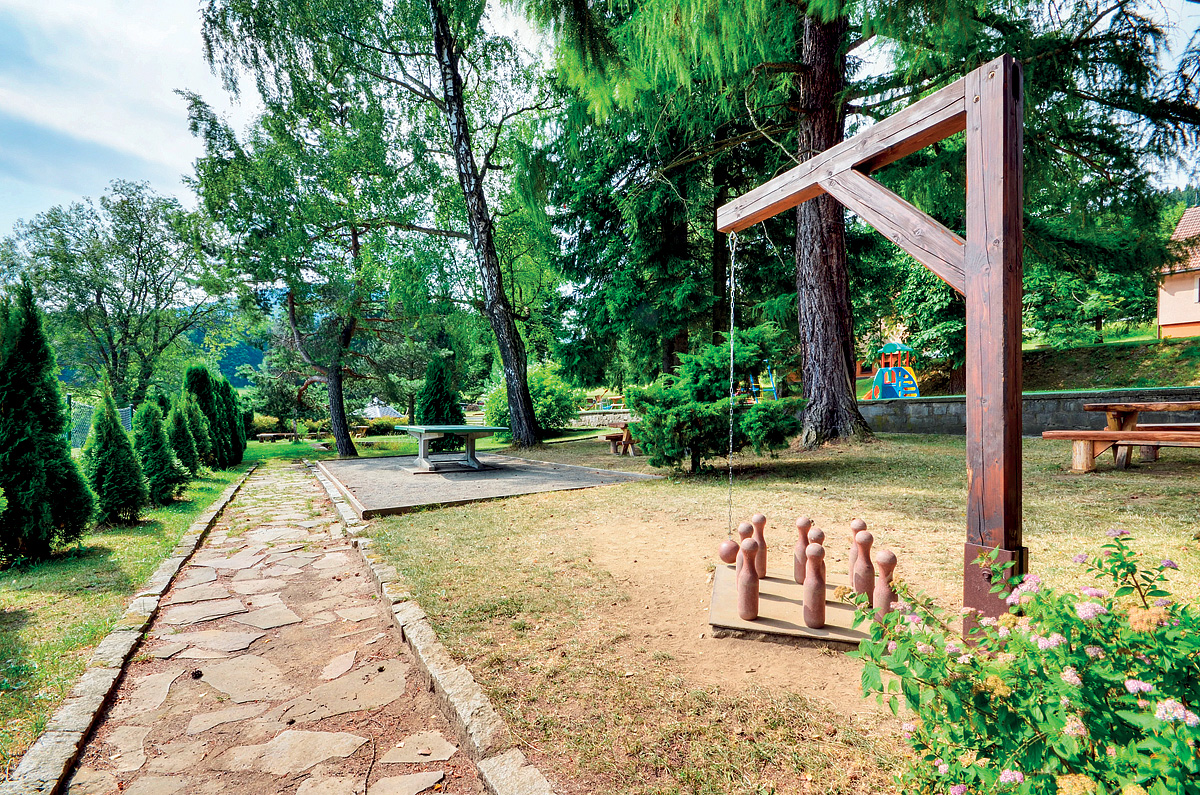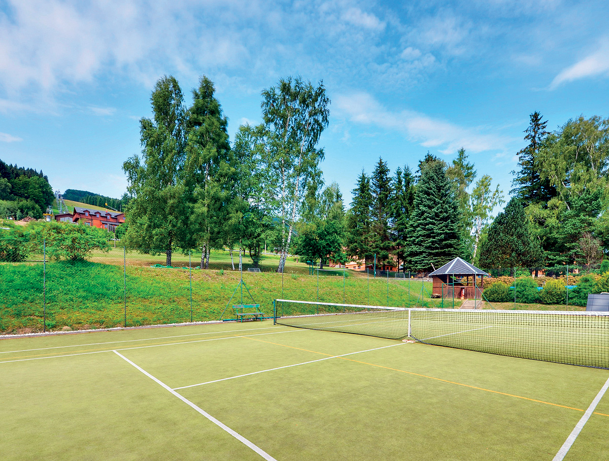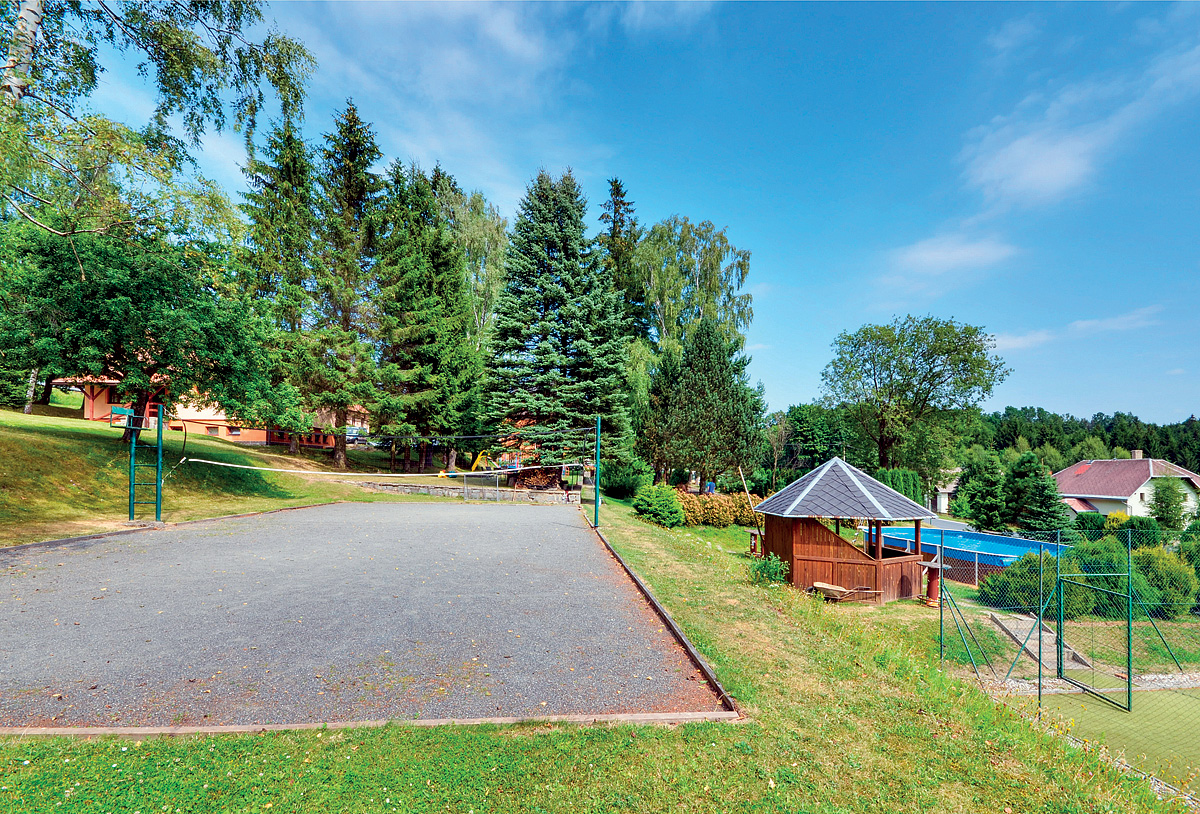 velká oplocená zahrada s dětským hřištěm, altánem, grilem, ohništěm, jezírkem, víceúčelovým hřištěm a tenisovým kurtem