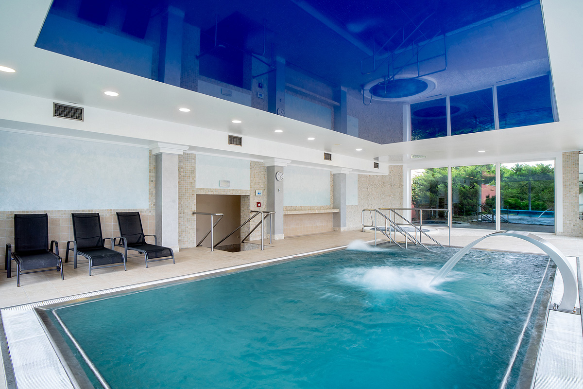 vnitřní bazén s chrličem a lehátky, vířivka, finská sauna, bylinná sauna, pára, infra sauna, ochlazovací koutek, zážitkové sprchym relaxační místnost s lehátky, solní jeskyně*, fitness; lázeňské procedury*, masáže*, zábaly*, koupele*, kadeřnictví*, manikůra*, pedikůra* venkovní bazén s lehátky