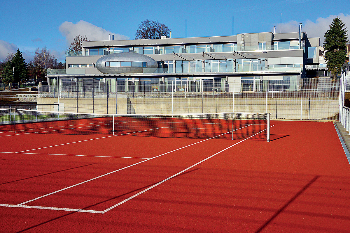 vnitřní bazén s protiproudem a vodoléčbou; venkovní bazén (biotop) s 20 m plaveckou dráhou, molem, lehátky a slunečníky; vnitřní vířivka až pro 10 osob, finská sauna, pára, infrasauna*, relaxační místnost s lehátky a výhledem; masáže*, perličková koupel*, suchá masážní vana*, turbosolárium*; nadstandardně vybavená posilovna, tělocvična, 2x kurt na squash či badminton; venkovní prostor vyhrazený pro cvičení, tenisový kurt, dráha na petanque