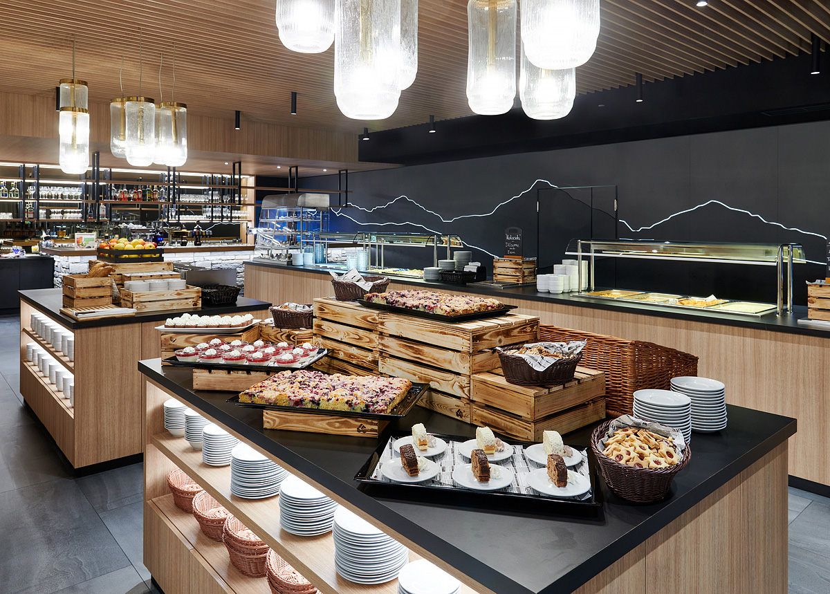 formou bufetu 3 studených předkrmů, 1 až 2 teplých předkrmů, 4 hlavních jídel, 4 příloh, salátů, 2 až 3 dezertů, ovoce a sýrů, nápoje za poplatek;