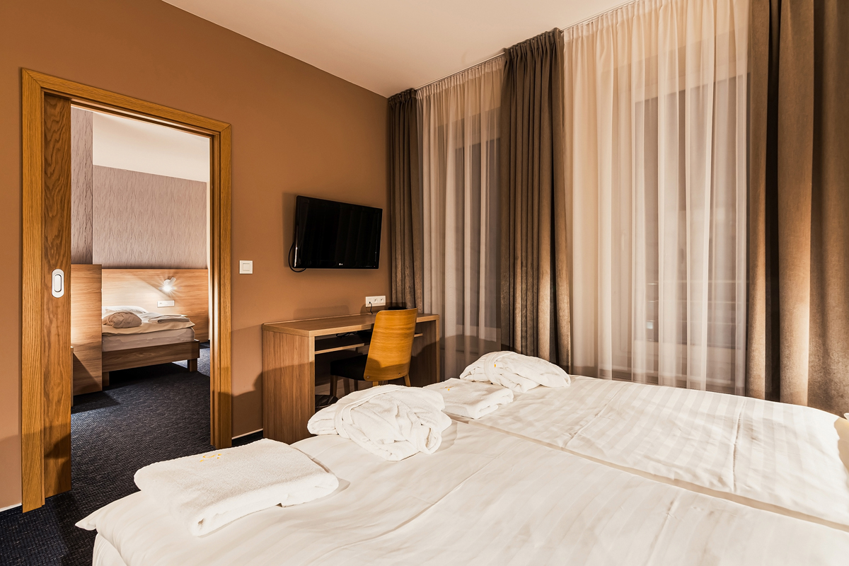 25 m² - pokoj s manželskou postelí či s oddělitelnými lůžky a 1 přistýlka pro 1 dítě do nedovršených 12 let, sociální zařízení, balkon