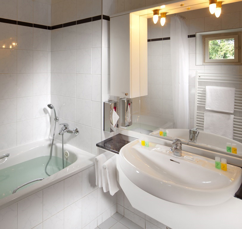 pokoj s jedním širokým lůžkem, sociální zařízení s vanou či sprchou, umístění pokojů v zadním traktu do atria, s výhledem do lesa