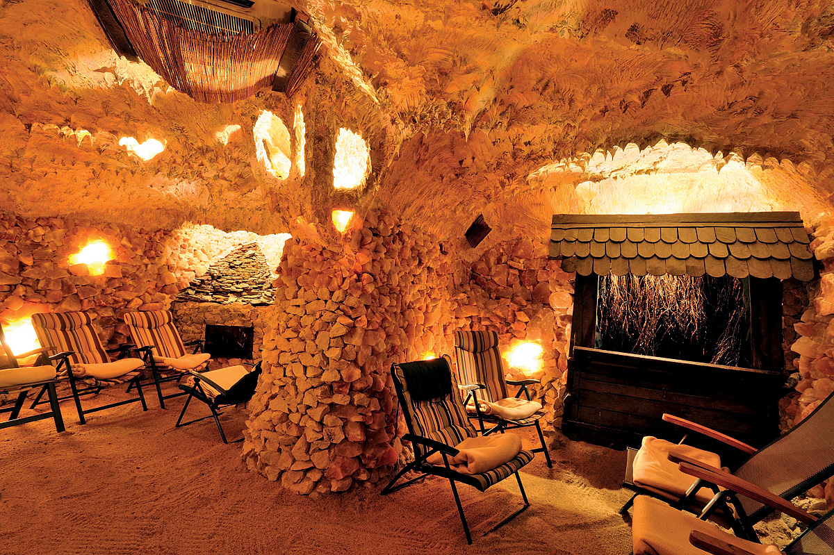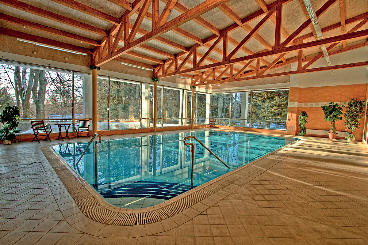 bazén 11 x 6 m s protiproudem, finská sauna*, infrasauna*, hydromasážní sprcha*, relaxační koutek s lehátky, masáže*, lázeňské kúry*, kosmetické služby*, zdravotní kúry*, velký sál pro aerobic