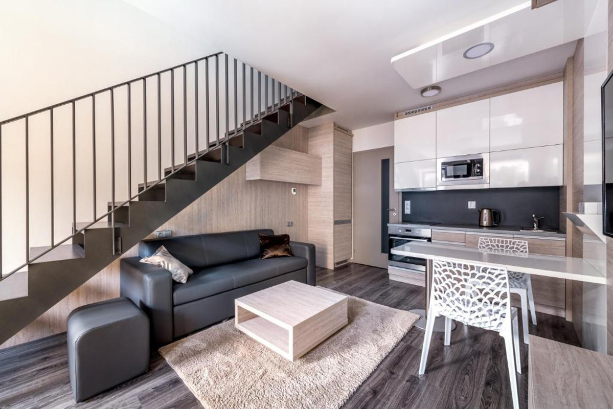 50 m² - 1 ložnice s manželskou postelí, obývací pokoj s kuchyňským koutem a rozkládacím gaučem pro 2 osoby, vstupní místnost, sociální zařízení zpravidla s vanou, balkon