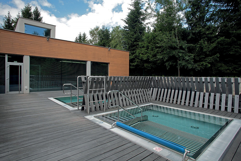 vnitřní bazén 12 x 5 m s vířivkou až pro 4 osoby, pára, infra sauna, venkovní bazén 20 x 8 m s dětským bazénkem a lehátky, wellness centrum#: vnitřní a venkovní vířivky#, 7x sauna# (finská cedrová, biosauna, tropická sauna...), infrakabina#, solná lázeň s inhalátorem#, amorova komora#, hammam# - parní lázeň, Kneippova lázeň#, ochlazovna#s bazénem, ledem a vědrem, odpočívárna sunset#, odpočívárna vital bar#, sluneční louka#, tepidárium#, terasa sunrise s prostorem pro relaxaci#; služby označené # mohou využívat osoby starší 15 let;