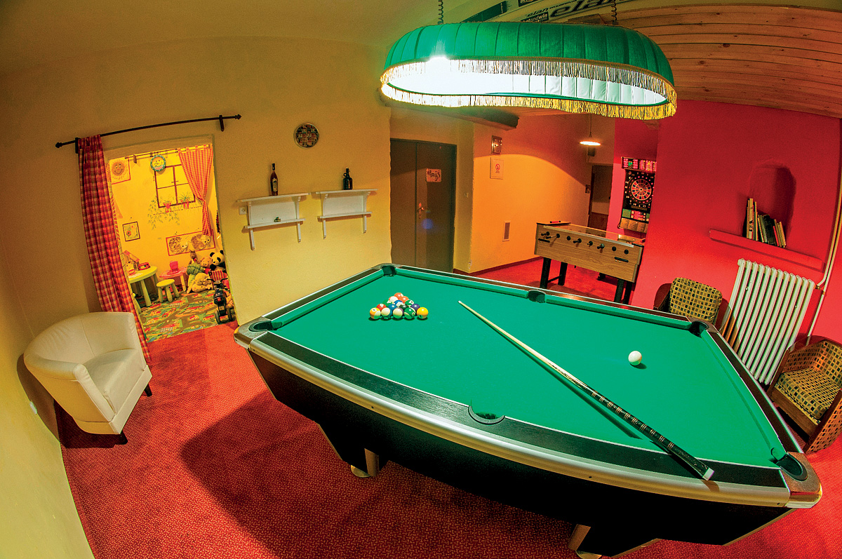 vířivka, finská sauna, ochlazovací bazének, masáže*, biliár*, šipky*, stolní fotbal*