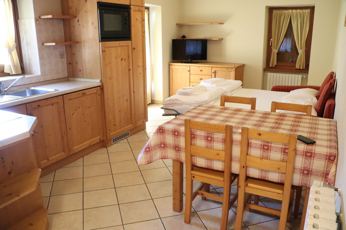 43 m² - 1 ložnice s manželskou postelí (u 2 apartmánů velikosti 1,5 běžného lůžka), 1 ložnice se 2 samostatnými lůžky, obývací pokoj s kuchyňským koutem a rozkládacím gaučem pro 2 osoby, sociální zařízení se sprchou, balkon (s výjimkou 1 apartmánu)