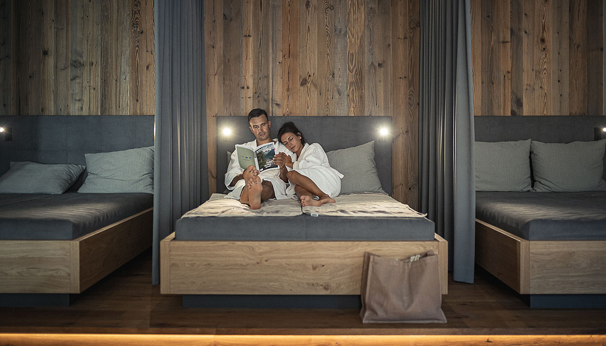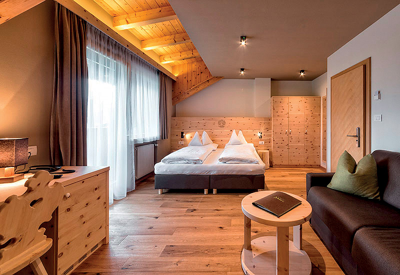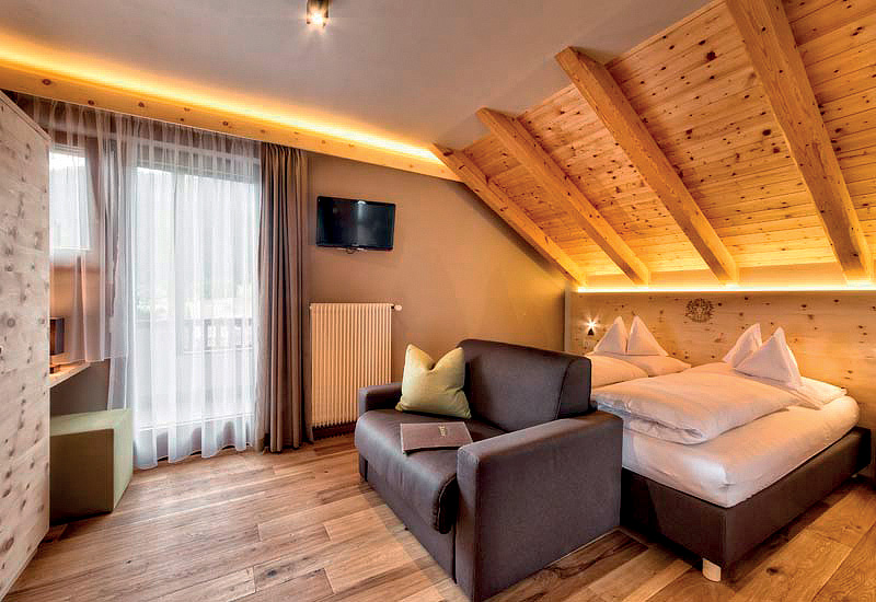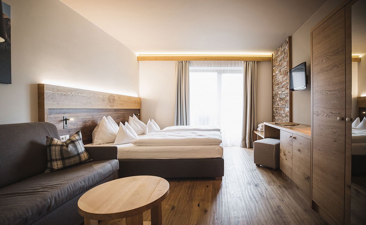 35 m² - pokoj s manželskou postelí a případně rozkládacím gaučem pro 1 či 2 osoby, sociální zařízení, balkon s výhledem na Dolomity