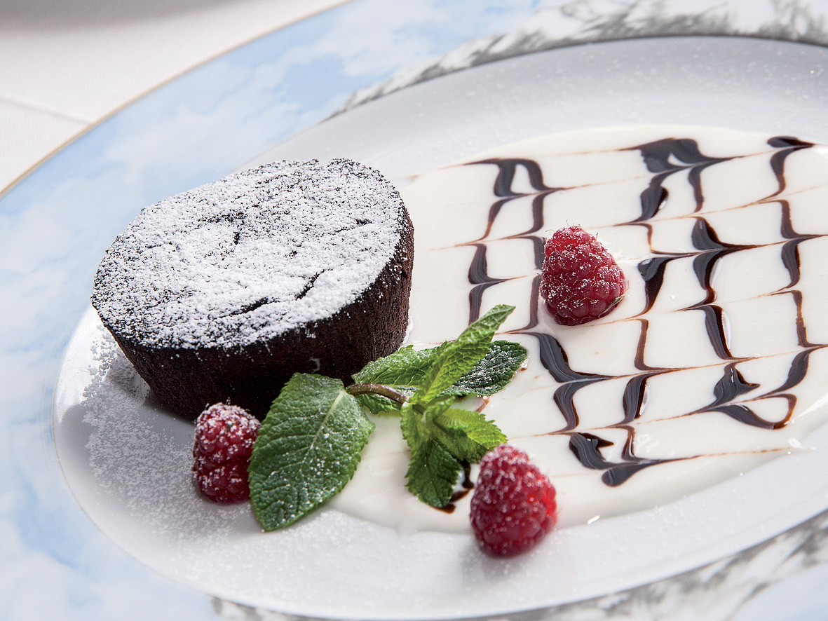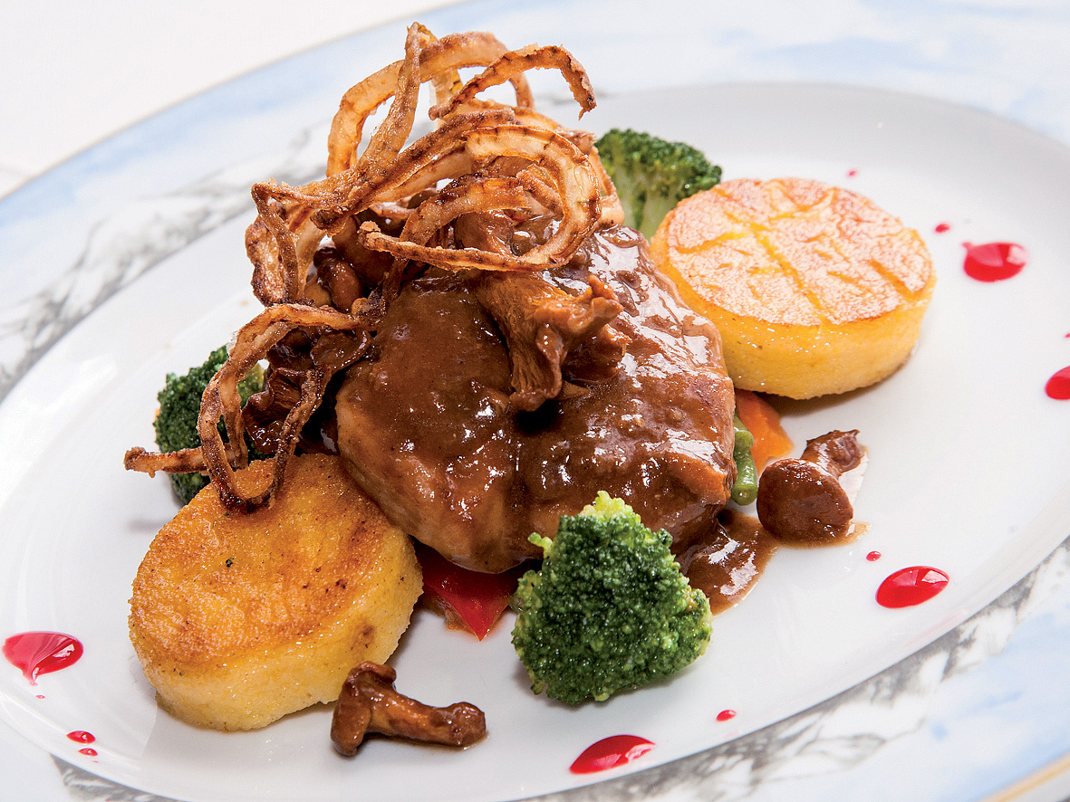 servírované menu s výběrem ze 2 teplých předkrmů a 2 hlavních jídel s přílohou, servírovaný dezert či sýry, salátový bufet, nápoje za poplatek