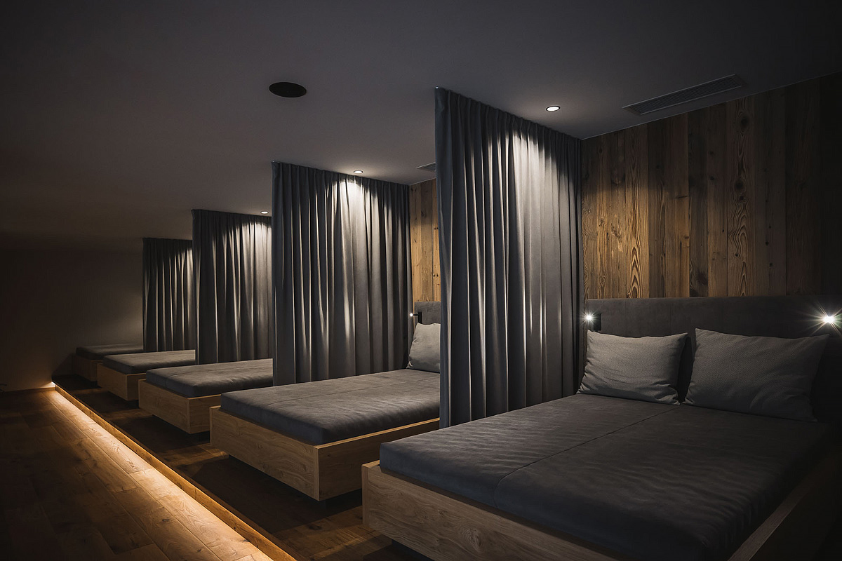 vnitřní bazén 10 x 4 m s vířivkou až pro 4 osoby, protiproudem, umělým vodopádem a lehátky, venkovní bazén, 6x sauna#, 2x pára#, tepidárium#, infrakabina#, 3x multifunkční sprcha, horizontální solárium*, relaxační koutek s lehátky, kneippův chodník, posilovna; služby označené # mohou využívat jen osoby od 16 let,