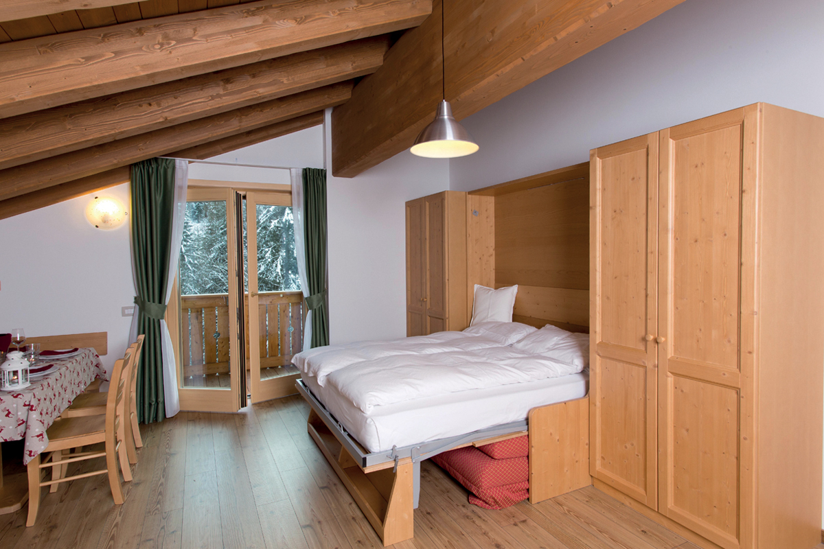 33 až 44 m² - obývací pokoj s kuchyňským koutem, skříňovou manželskou postelí a palandou či 2 samostatnými lůžky (u některých apartmánů v částečně oddělené místnosti), sociální zařízení