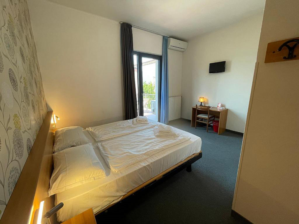 pokoj s manželskou postelí či 2 samostatnými lůžky, sociální zařízení se sprchou, balkon