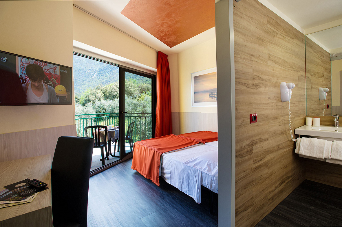 19 m² - pokoj s manželskou postelí či 2 samostatnými lůžky, sociální zařízení se sprchou, balkon s bočním výhledem na jezero