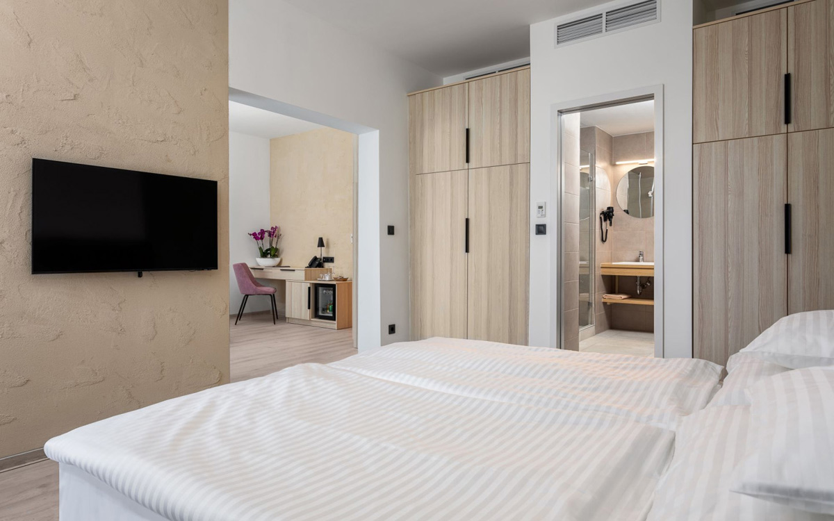 Na vyžádání i velké rodinné pokoje či bezbariérový pokoj. Dle dispozic budovy, hotel disponuje zhruba polovina pokojů s balkónem, které nelze garantovat.