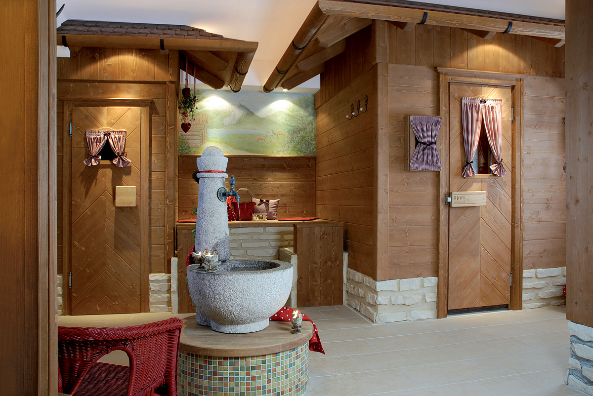 vířivka*, finská sauna, bio sauna, pára, infrakabina, relaxační koutek s lehátky, Kneippův chodník, masáže*, kosmetické služby*