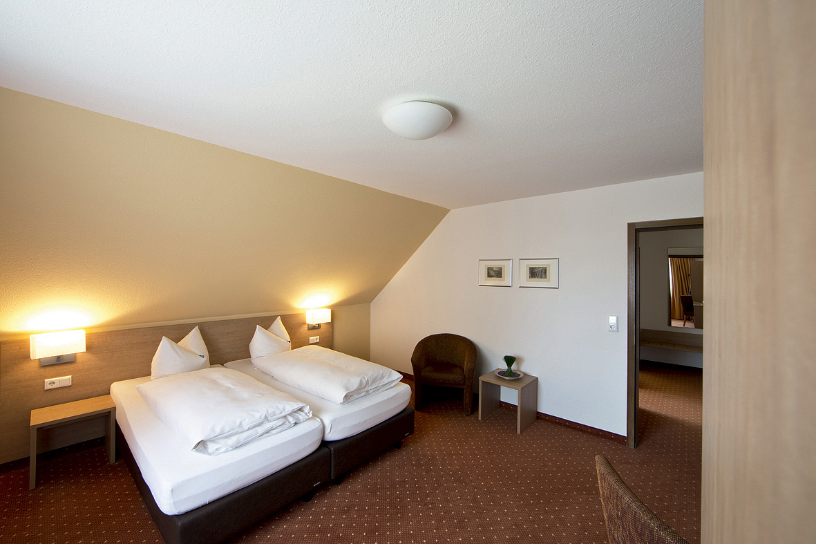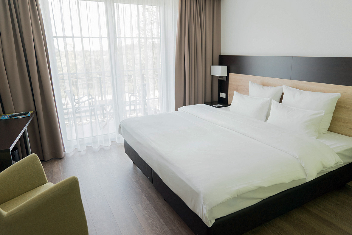 20 m² - pokoj s manželskou postelí, sociální zařízení se sprchou, balkon či terasa; moderně zařízené pokoje v nové části hlavní budovy