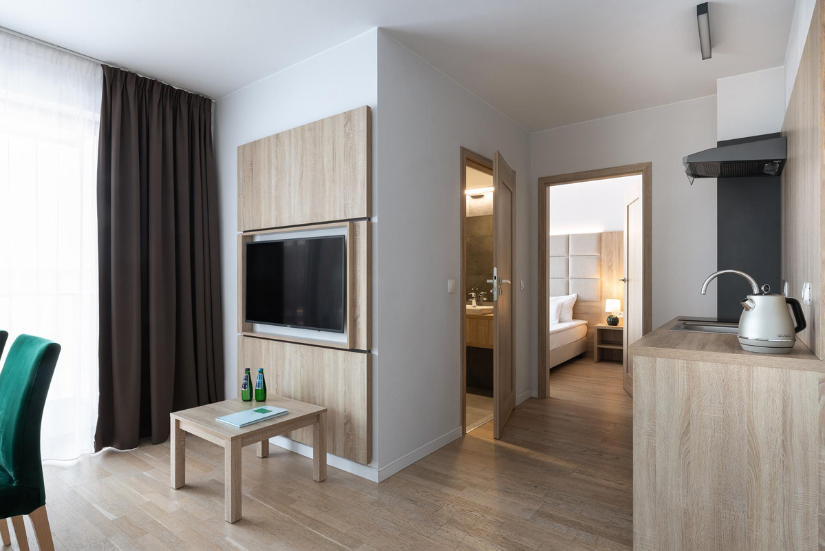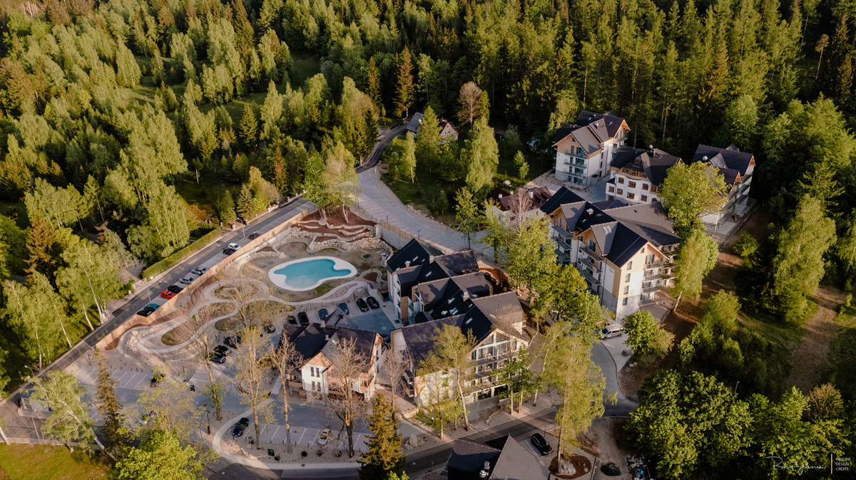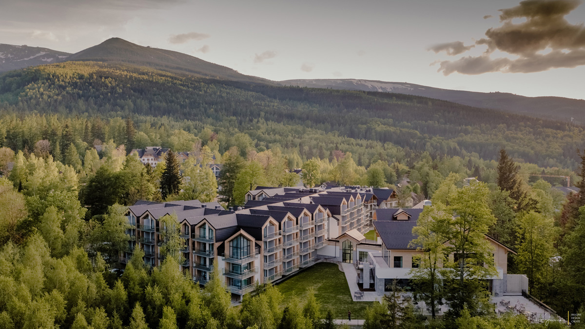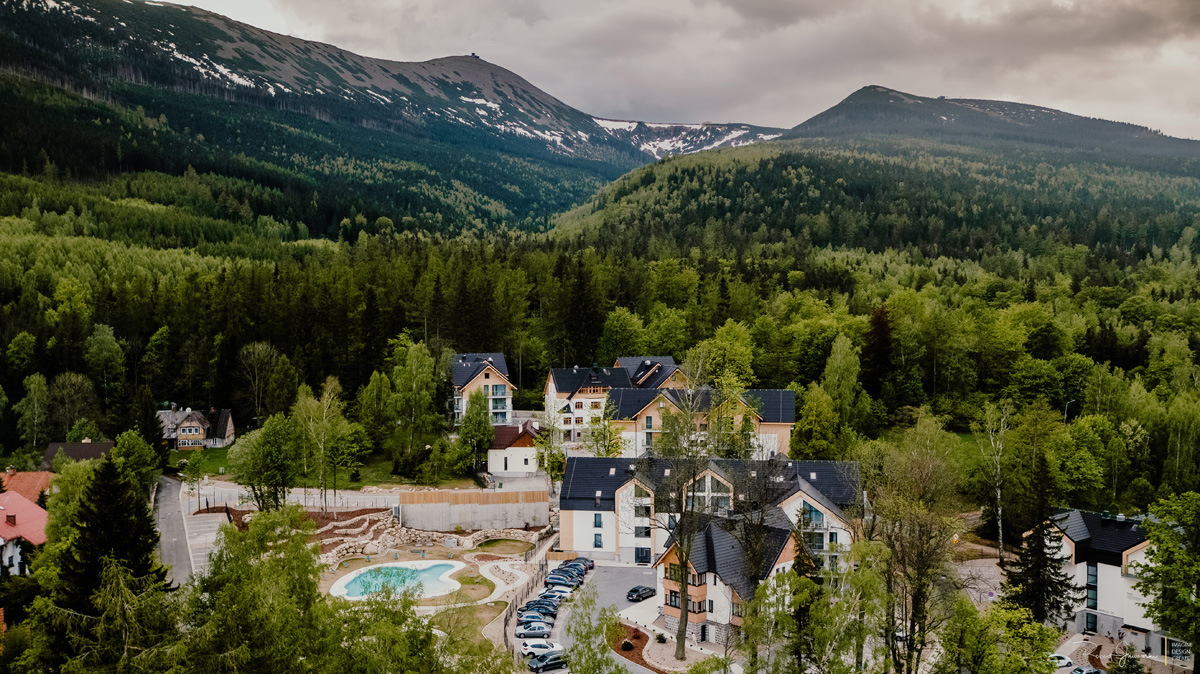 moderní resort v klidné části horského střediska Karpacz, v blízkosti turistických tras a hlavních atrakcí, resort se skládá z hlavní budovy – 5* hotel a samostatné budovy s apartmány, které jsou nekategorizované, vzdálenost od hotelové budovy je cca 200 metrů, v apartmánech není zajištěn denní úklid (pouze za na vyžádaní za příplatek) a nejsou klimatizované