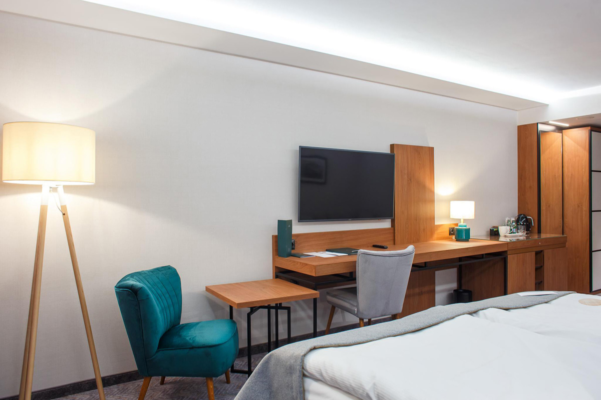 klimatizace, TV, wi-fi připojení k internetu, fén, trezor, set na kávu a čaj, žehlící set, kosmetický set, župany a pantofle do wellness