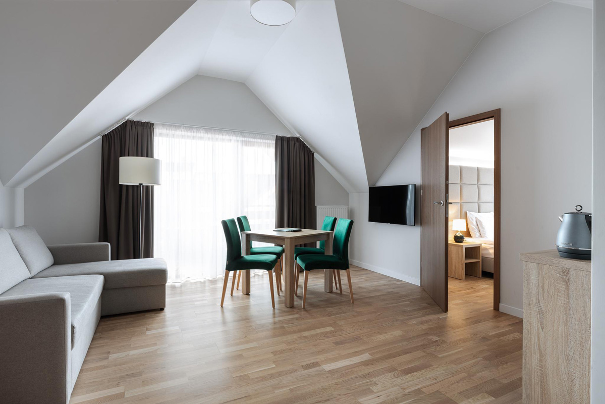 50 m² – dvoupodlažní pokoj tvoří obývací pokoj s rozkládacím gaučem pro 2 osoby, samostatná ložnice (ve 2.podlaží) s velkou manželskou posteli typu kingsize bed, sociální zařízení se sprchou, balkón