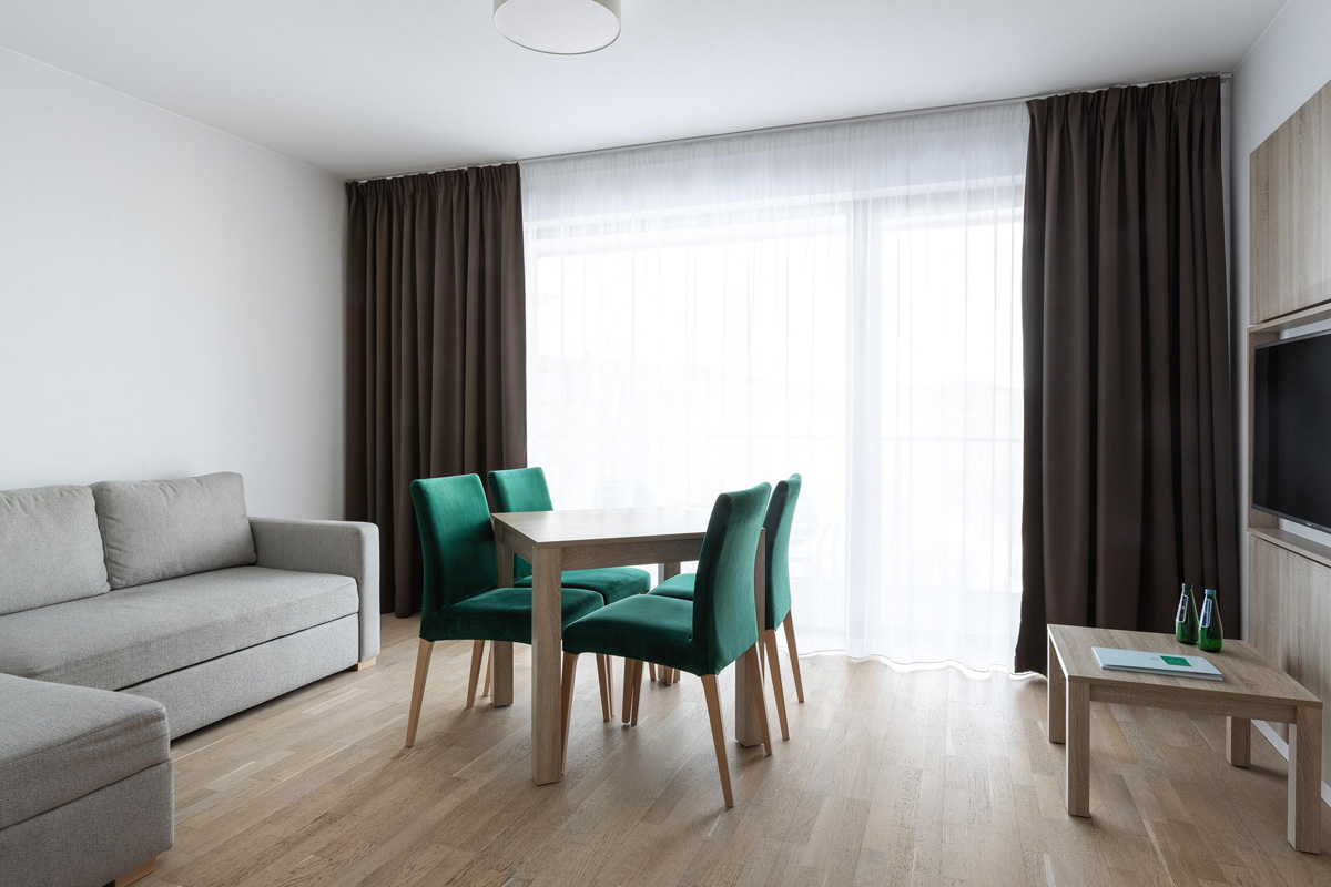 45 m² - obývací pokoj s rozkládacím gaučem pro 2 osoby, ložnice s manželskou postelí či 2 oddělitelnými lůžky, privátní sauna, sociální zařízení se sprchou, balkón či terasa, některé s výhledem na hory
