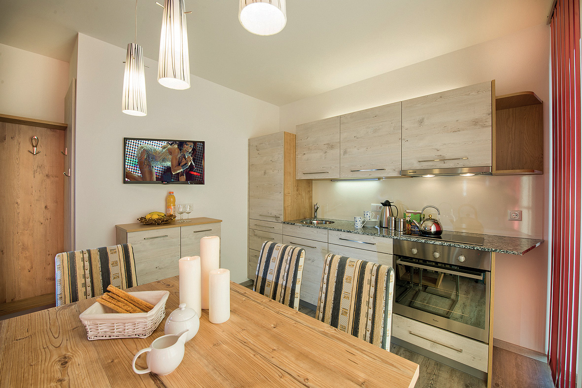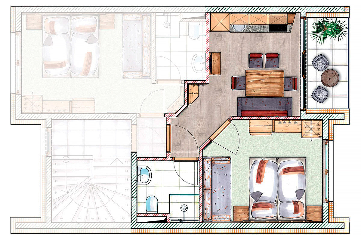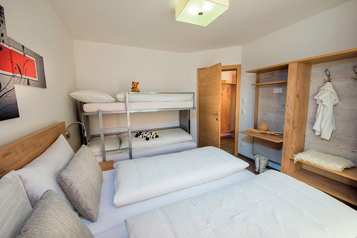 80 m² - 1 ložnice s manželskou postelí, 1 ložnice s manželskou postelí a palandou, obývací pokoj s rozkládacím gaučem až pro 4 osoby, kuchyňský koutem, 2x sociální zařízení, oddělené WC, balkon či terasa; apartmán má zpravidla 2 podlaží a minimální obsazenost apartmánu jsou 4 osoby