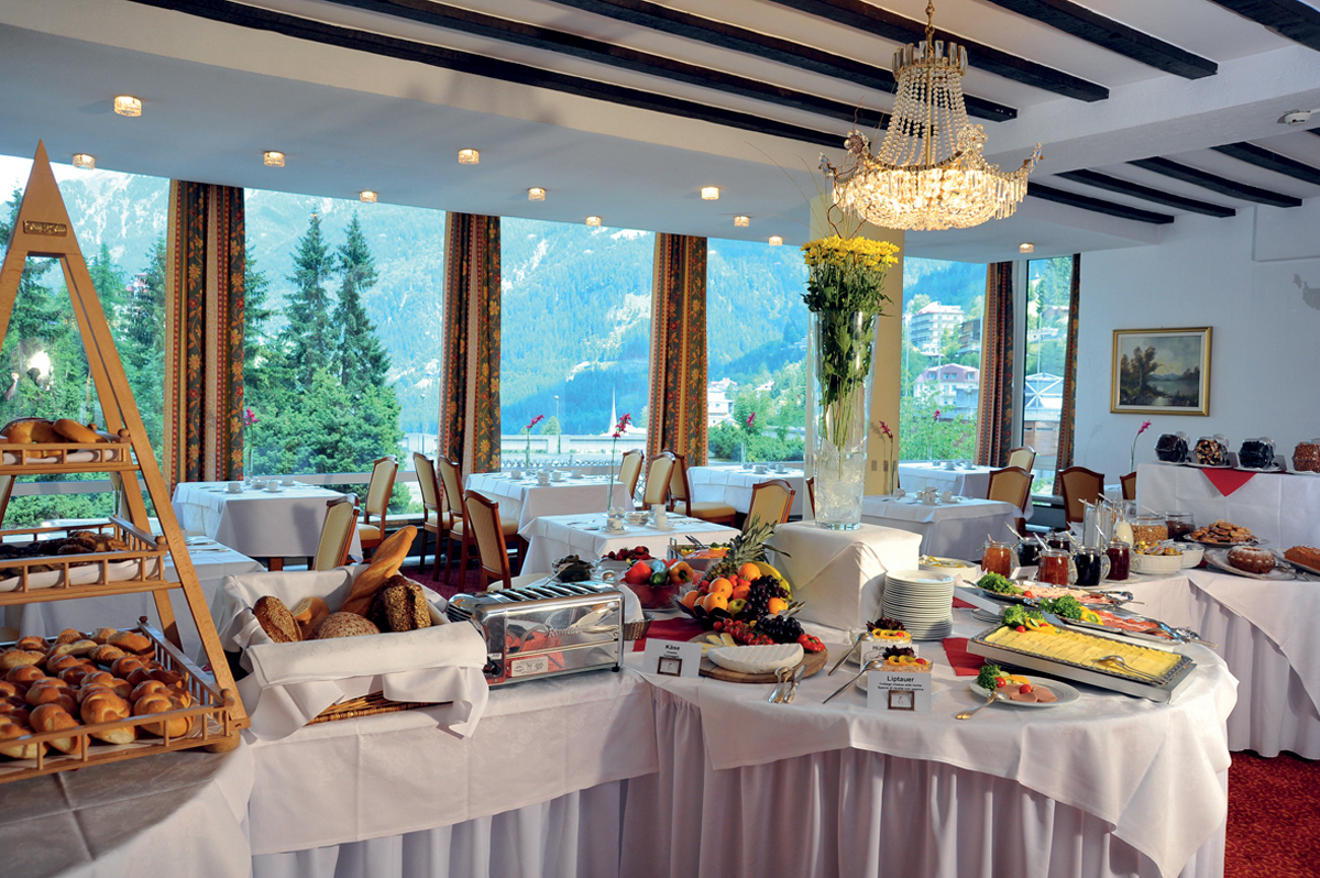 zpravidla formou 4chodového bufetu s výběrem z několika hlavních jídel s přílohou, nápoje za poplatek; veganská a vegetariánská strava za příplatek 12 €/chod, bezlaktózová a bezlepková strava bez příplatku; při pozdním přijezdu lze do 20.30 hod. nahlásit zájem o studenou večeři (talíř na pokoj)