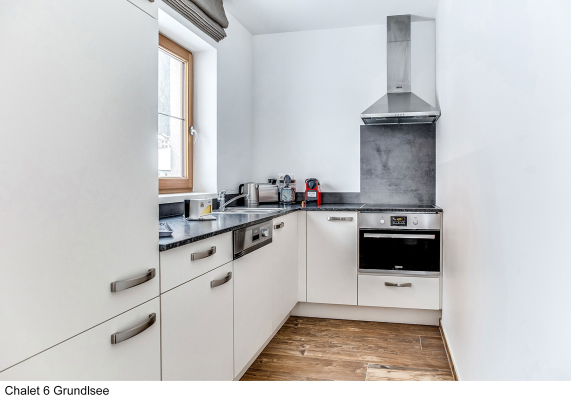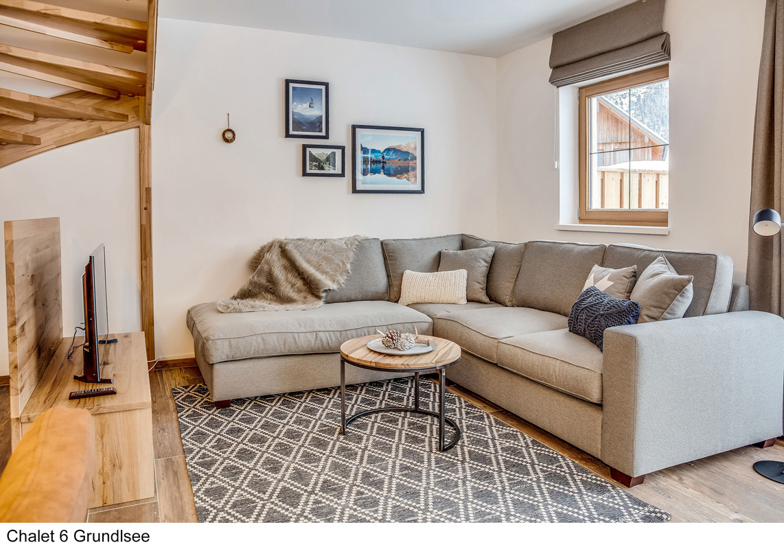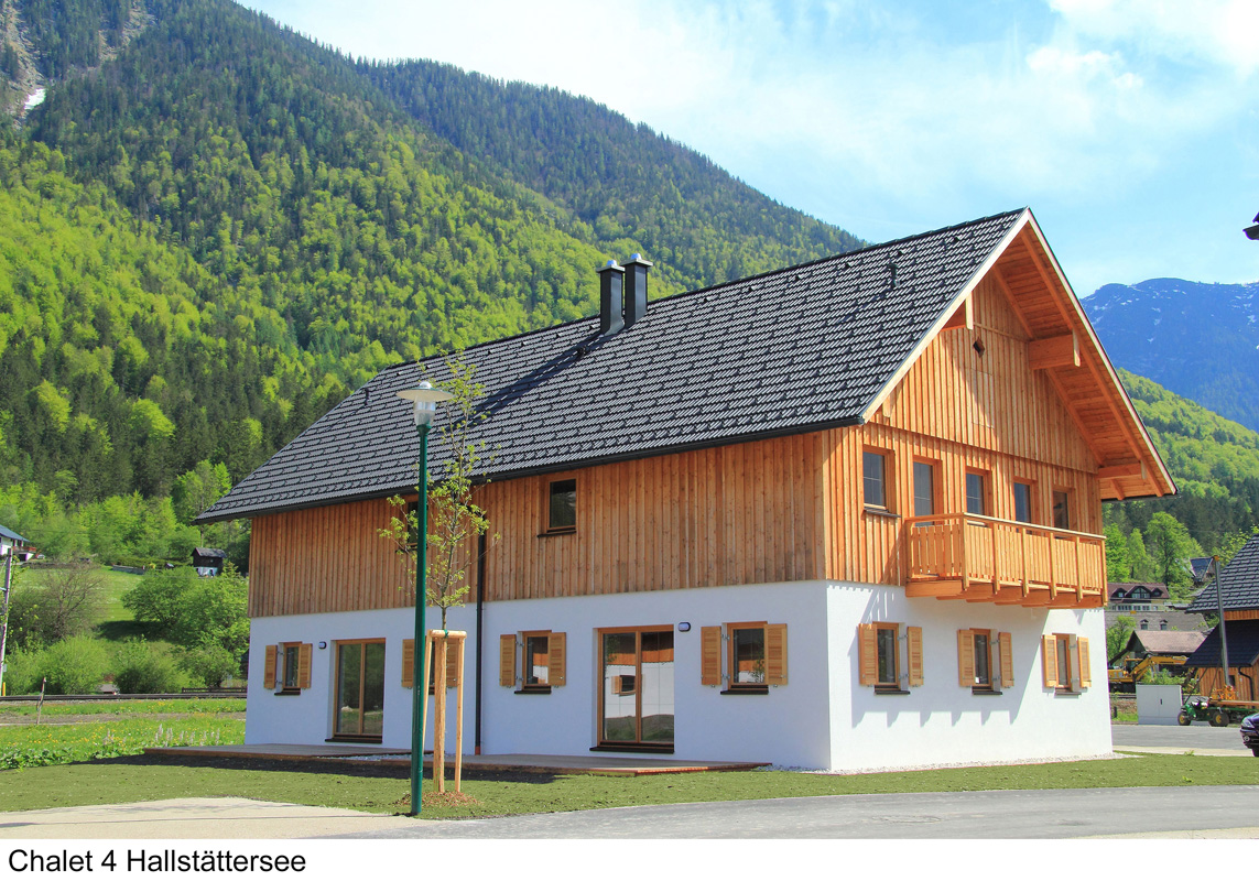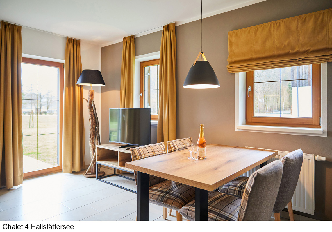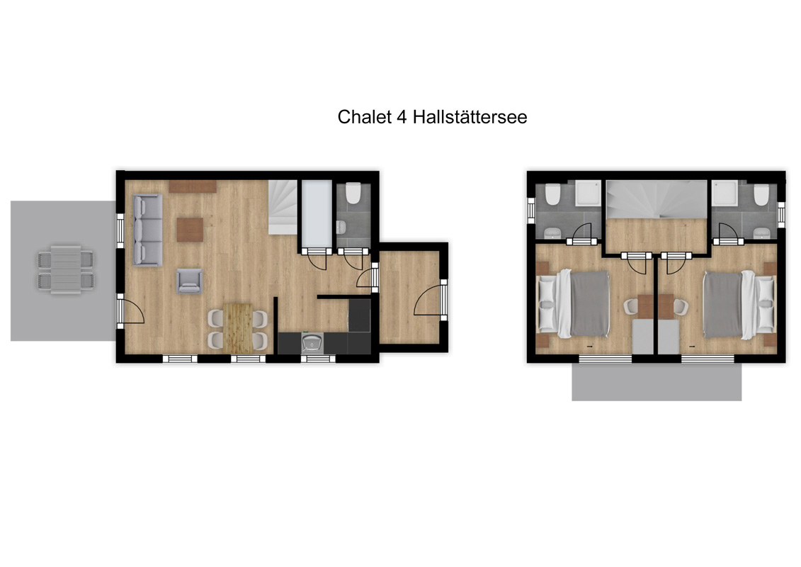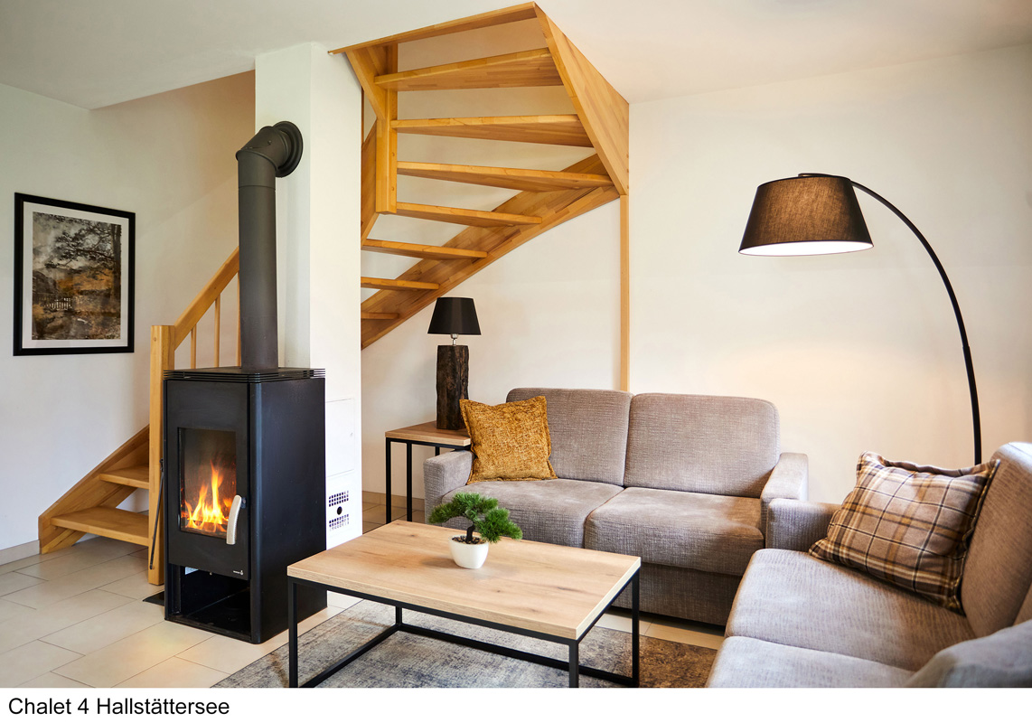 Chalet 4 Hallstättersee - 65 m² - 1. podlaží chaletu: obývací pokoj s kuchyňským a jídelním koutem, gauč, samostatné WC, terasa; 2. podlaží chaletu: 2 ložnice s manželskou postelí či 2 samostatnými lůžky, 2x sociální zařízení se sprchou (vstup vždy z ložnice), balkon