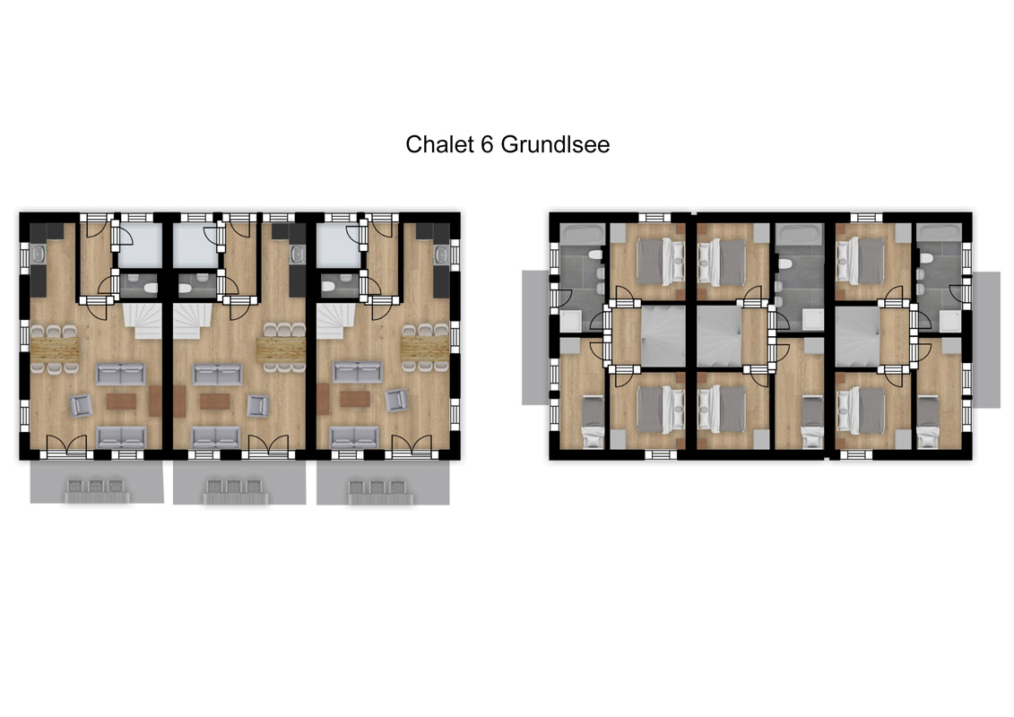 Chalet 6 Attersee - 110 m² - 1. podlaží chaletu: obývací pokoj s kuchyňským a jídelním koutem, gauč, sociální zařízení se sprchou, samostatné WC, terasa; 2. podlaží chaletu: 3 ložnice s manželskou postelí či 2 samostatnými lůžky, 1x sociální zařízení s vanou, 1x sociální zařízení se sprchou, balkon (společný pro 2 ložnice)