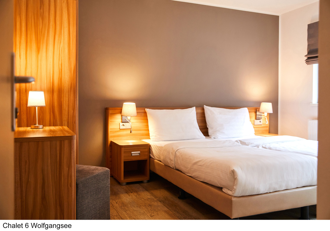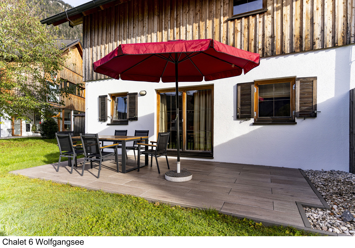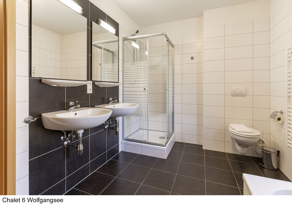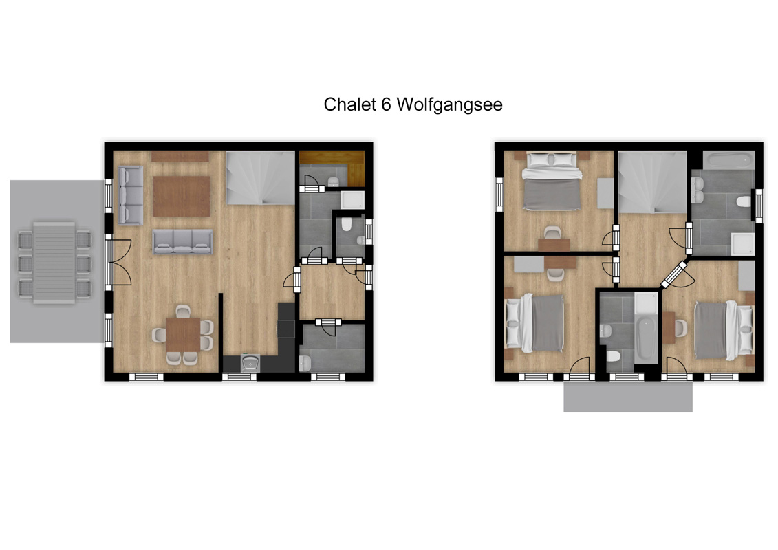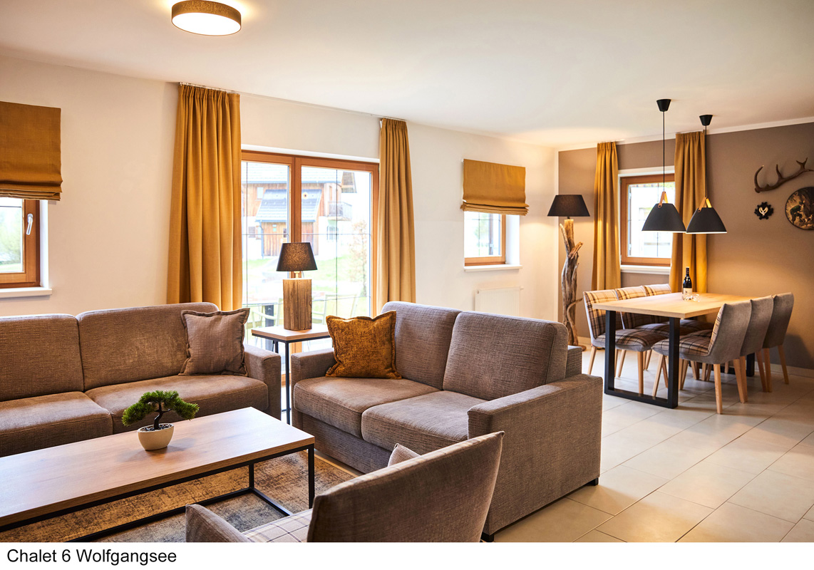 Chalet 6 Wolfgangsee - 110 m² - 1. podlaží chaletu: obývací pokoj s kuchyňským a jídelním koutem, gauč, samostatné WC, privátní sauna se sprchou, terasa; 2. podlaží chaletu: 3 ložnice s manželskou postelí či 2 samostatnými lůžky, 2x sociální zařízení se sprchou, balkon (společný pro 2 ložnice)