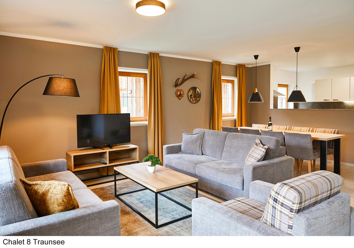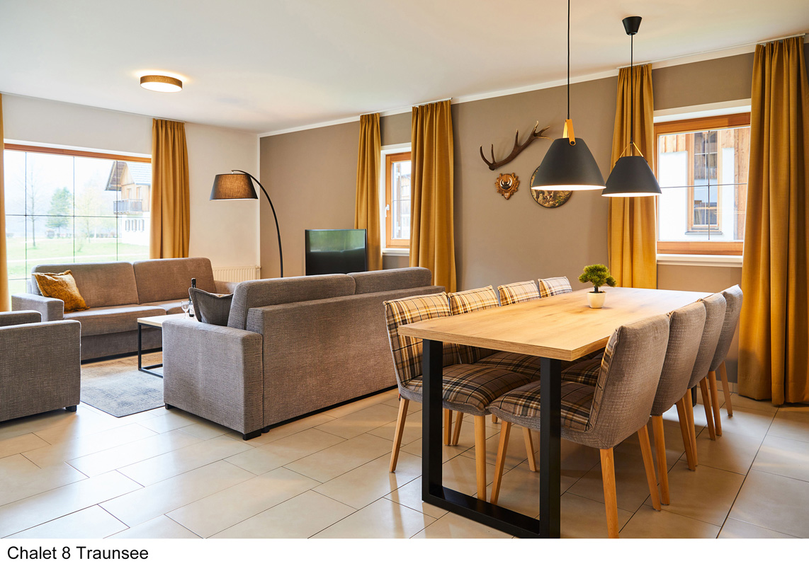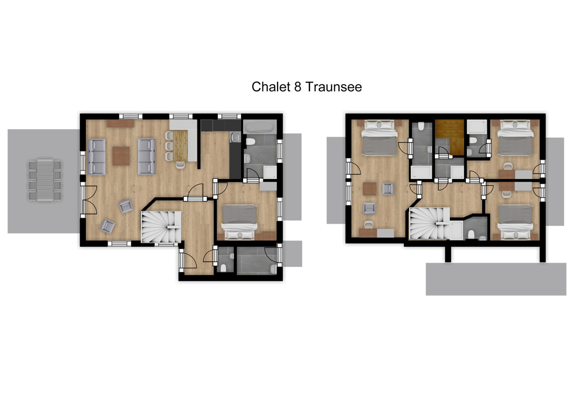 Chalet 8 Traunsee - 140 m² - 1. podlaží chaletu: ložnice s manželskou postelí či 2 samostatnými lůžky a sociálním zařízením se sprchou, obývací pokoj s kuchyňským a jídelním koutem, gauč, samostatné WC, terasa; 2. podlaží chaletu: 3 ložnice s manželskou postelí či 2 samostatnými lůžky a sociálním zařízením se sprchou, privátní sauna se sprchou, 2 balkony (z nich 1 společný pro 2 ložnice)