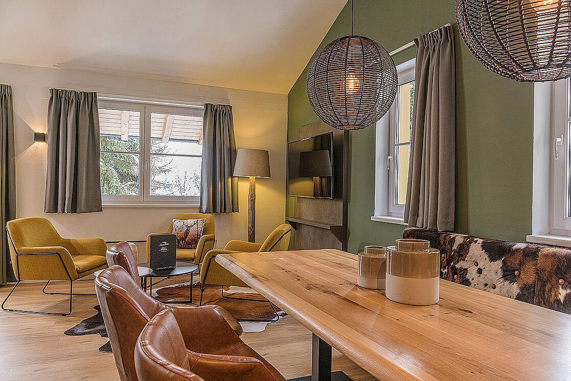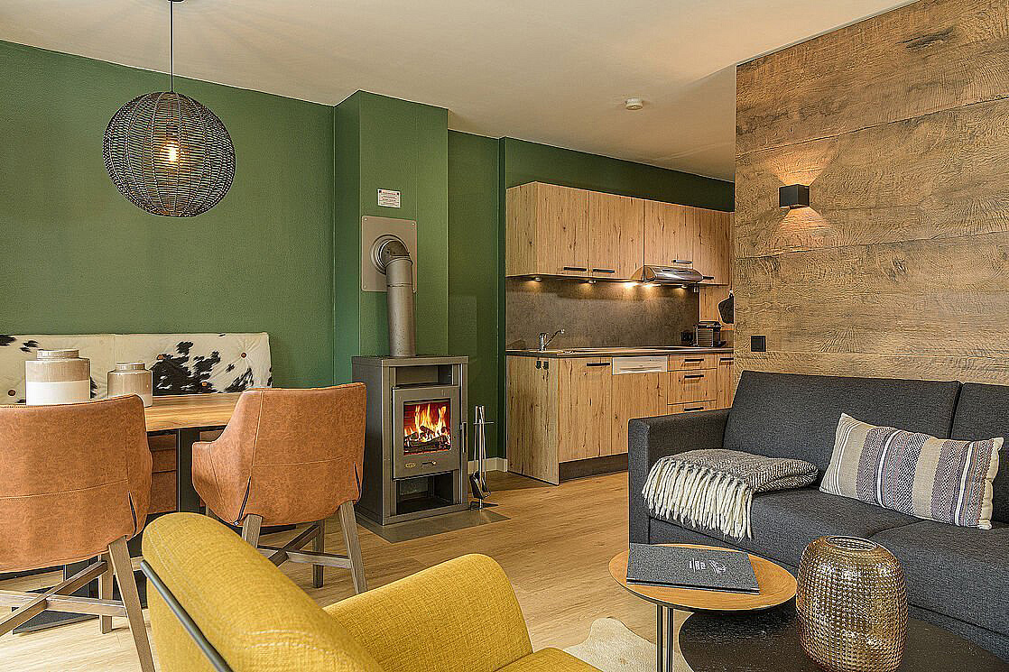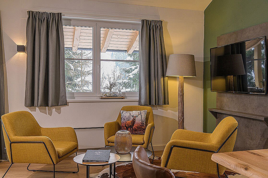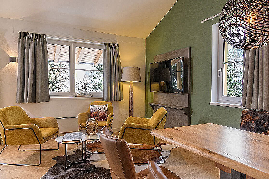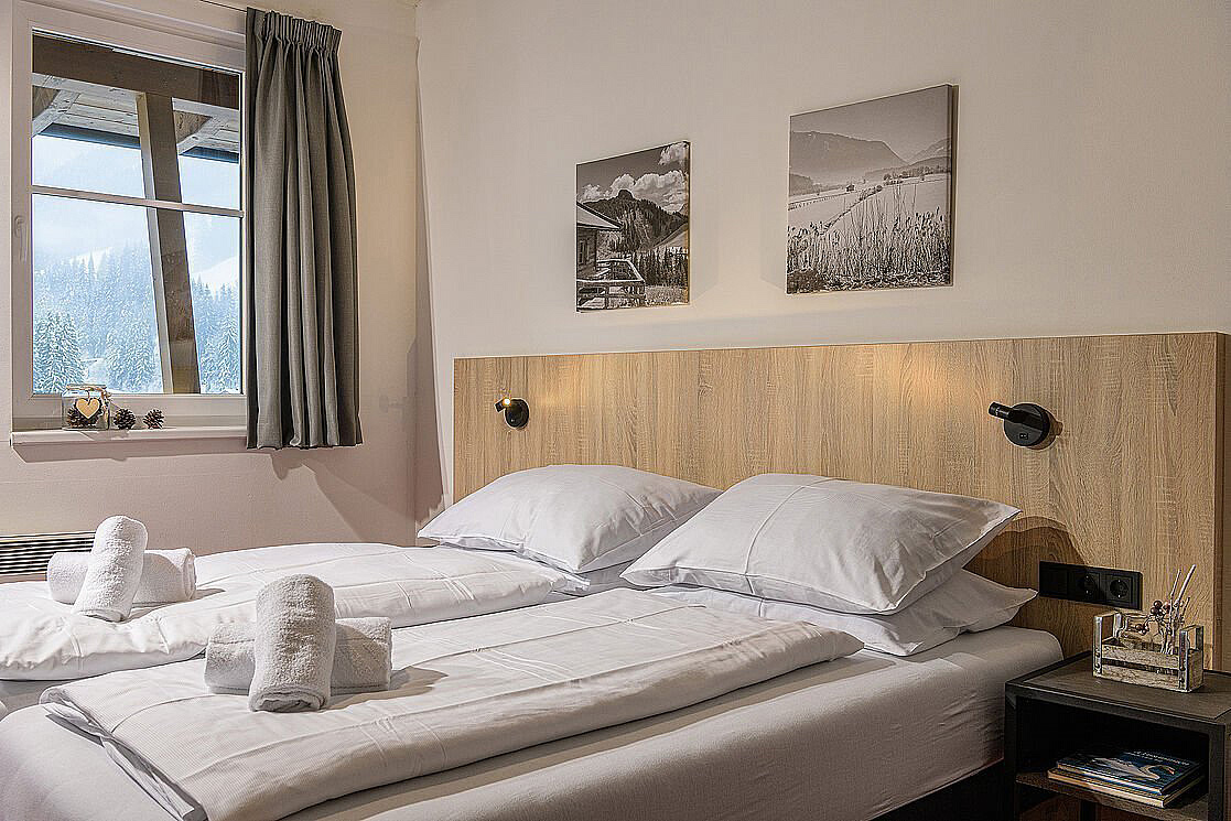 80 m² 2 ložnice s manželskou postelí, obývací pokoj s kuchyňským koutem a rozkládacím gaučem až pro 2 osoby, 2x sociální zařízení, oddělené WC, balkon či terasa; apartmány jsou v hlavní budově s výtahem; v ceně užití sauny určené pouze pro apartmány v hlavní budově