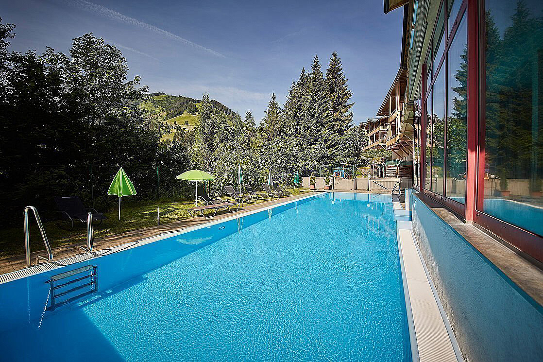 venkovní bazén 20 x 6 m, dětský bazének, vířivka, finská sauna, bio sauna, relaxační koutek s lehátky