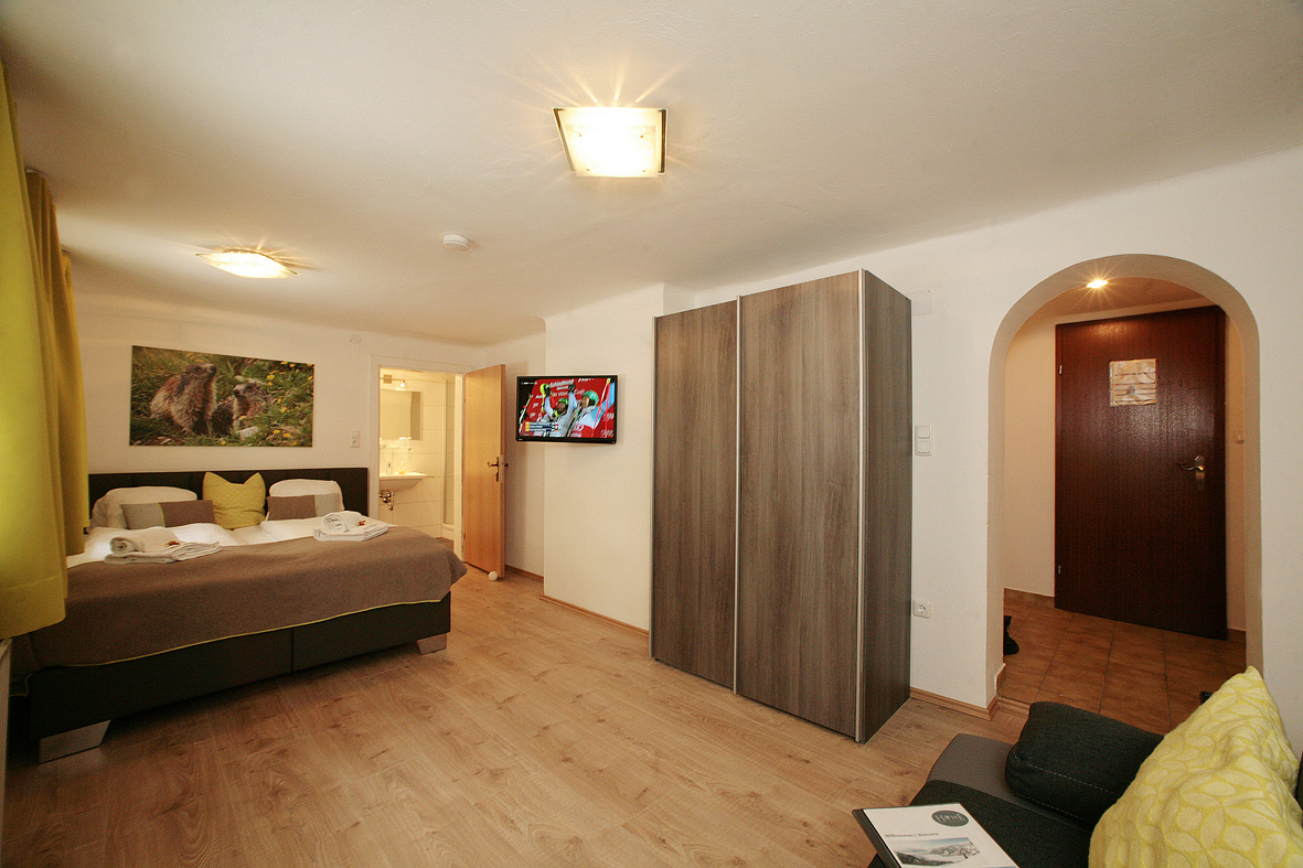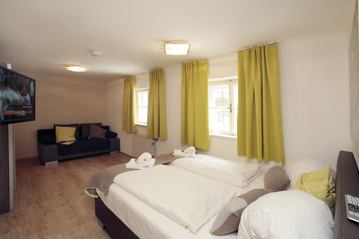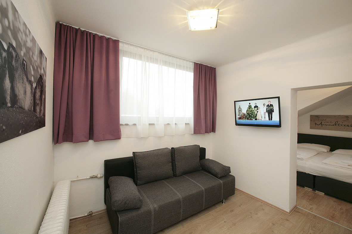 27 m² - pokoj s manželskou postelí a rozkládacím gaučem pro 2 děti do nedovršených 13 let, sociální zařízení pokoje jsou zpravidla pod úrovní silnice a pouze s menšími okny