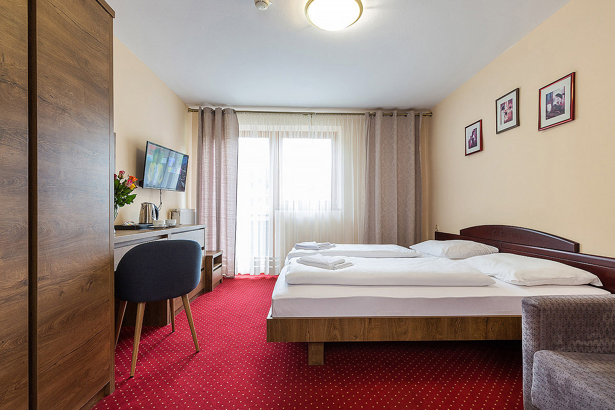 22 až 24 m² - pokoj s manželskou postelí a případně dalším samostatným lůžkem či rozkládacím gaučem pro 1 až 2 osoby, sociální zařízení se sprchou či vanou, balkon