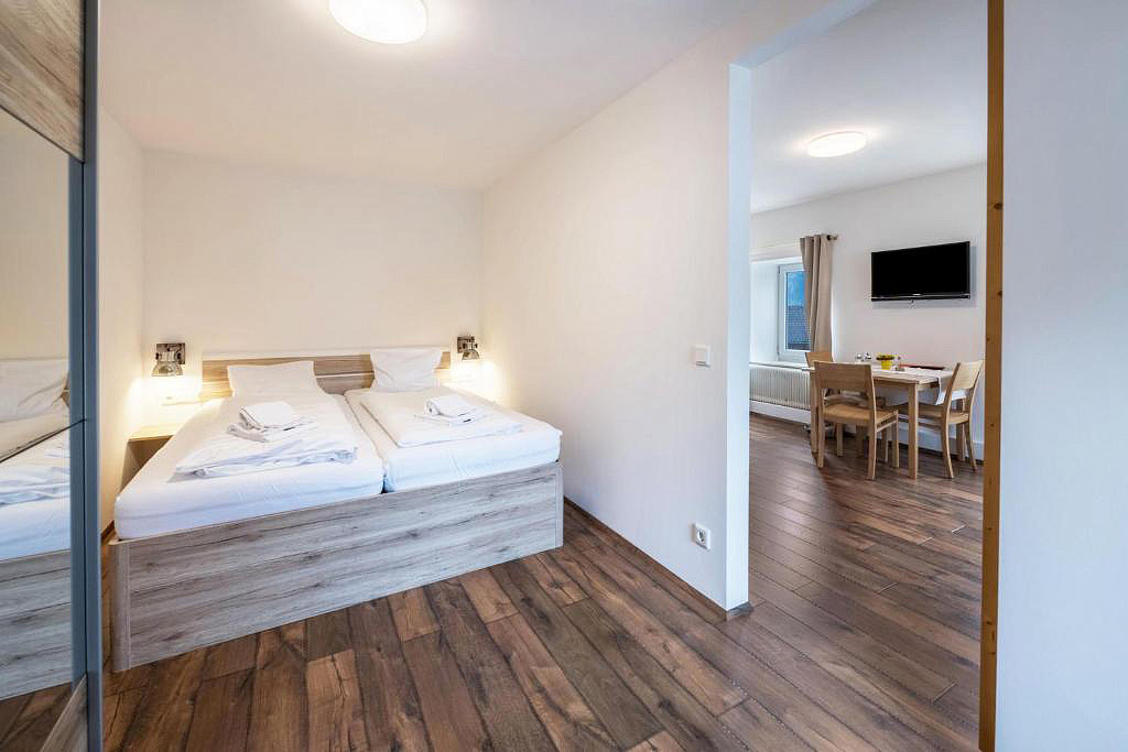 58 m² - 2 ložnice s manželskou postelí, obývací pokoj s kuchyňským koutem a s rozkládacím gaučem pro 2 osoby, sociální zařízení se sprchou