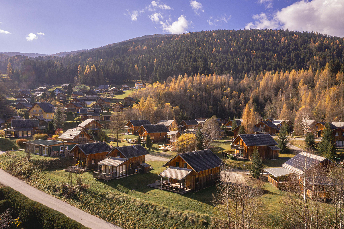 ubytovací komplex skládající se z mnoha chaletů a budovy s recepcí