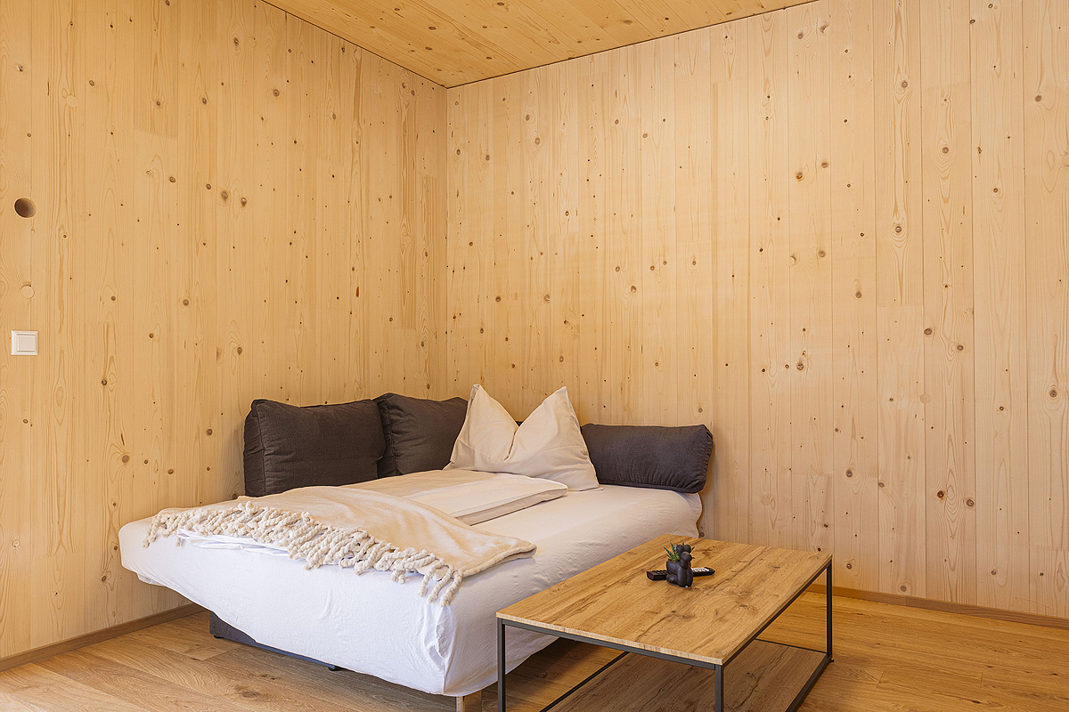 40 m² - ložnice s manželskou postelí, obývací pokoj s kuchyňským koutem a rozkládacím gaučem pro 2 osoby, sociální zařízení s privátní finskou saunou, balkon či terasa