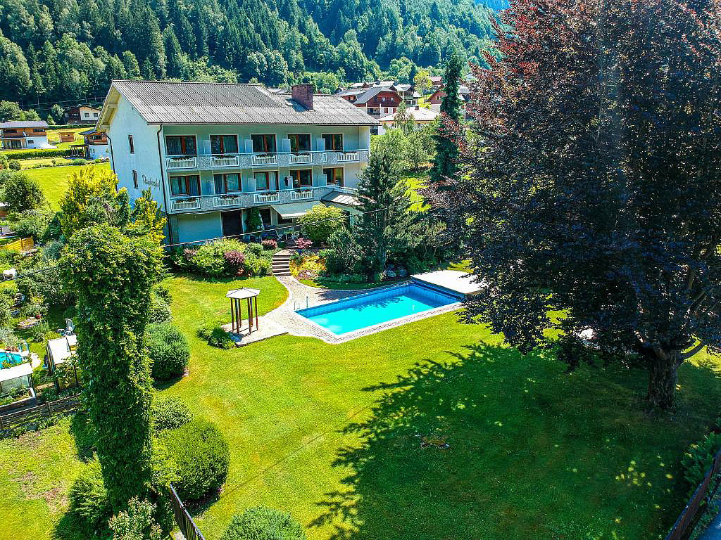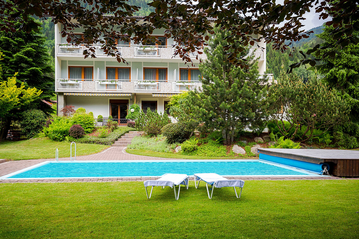 menší hotel s velkou zahradou a venkovním bazénem v docházkové vzdálenosti od jezera