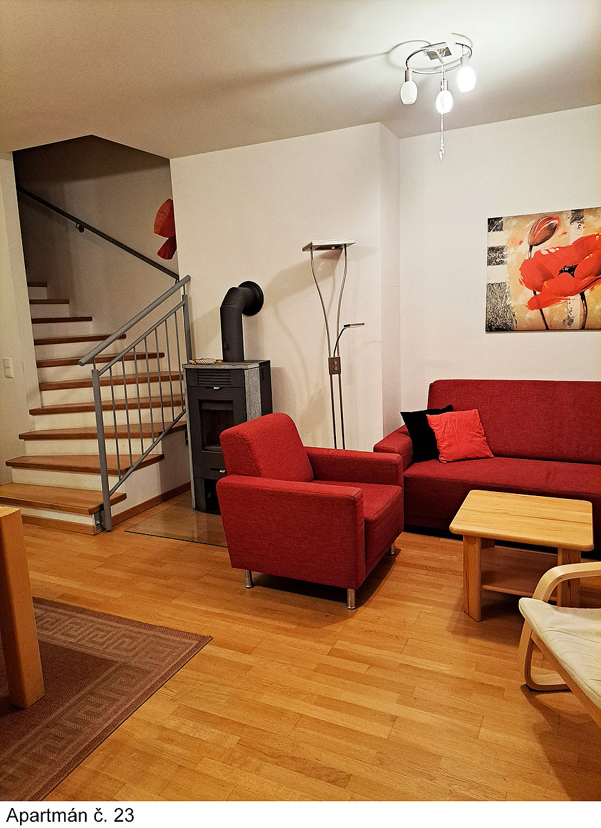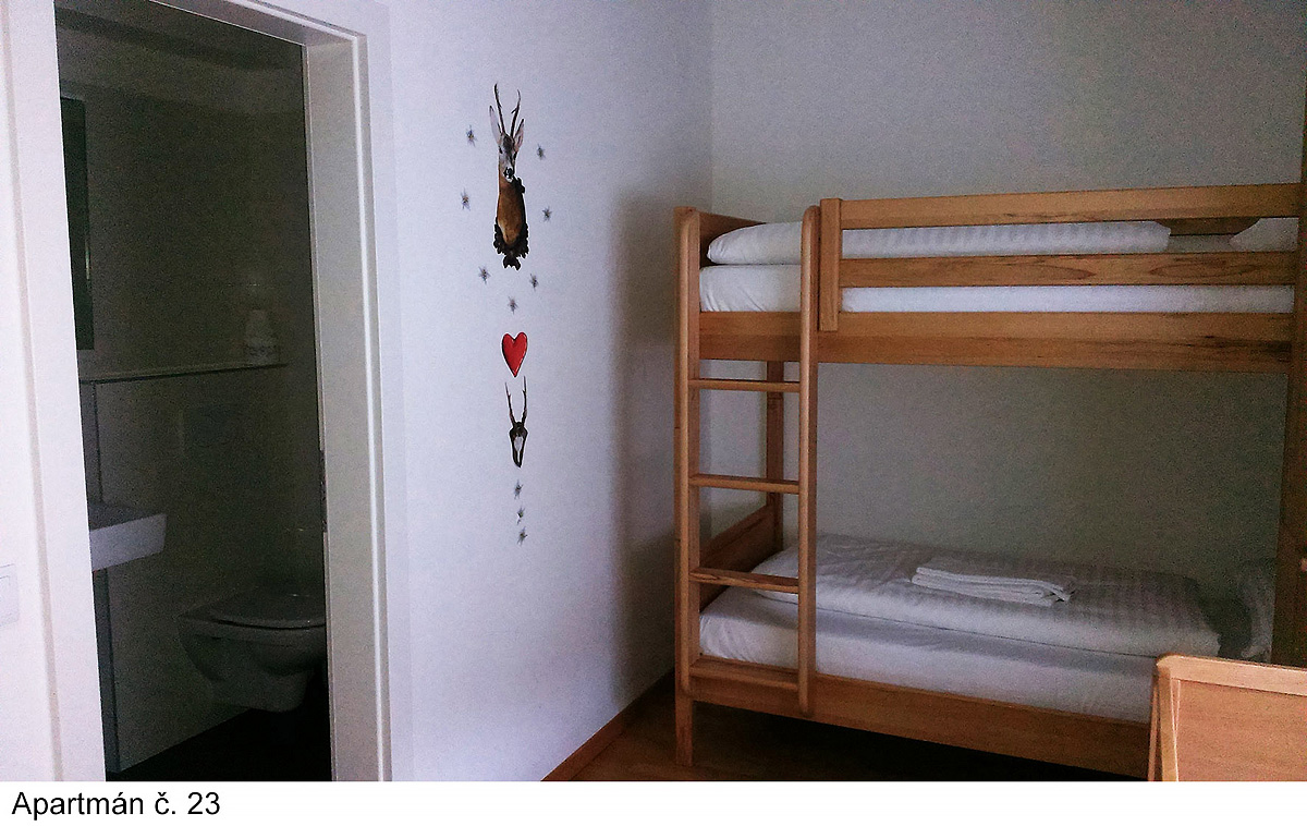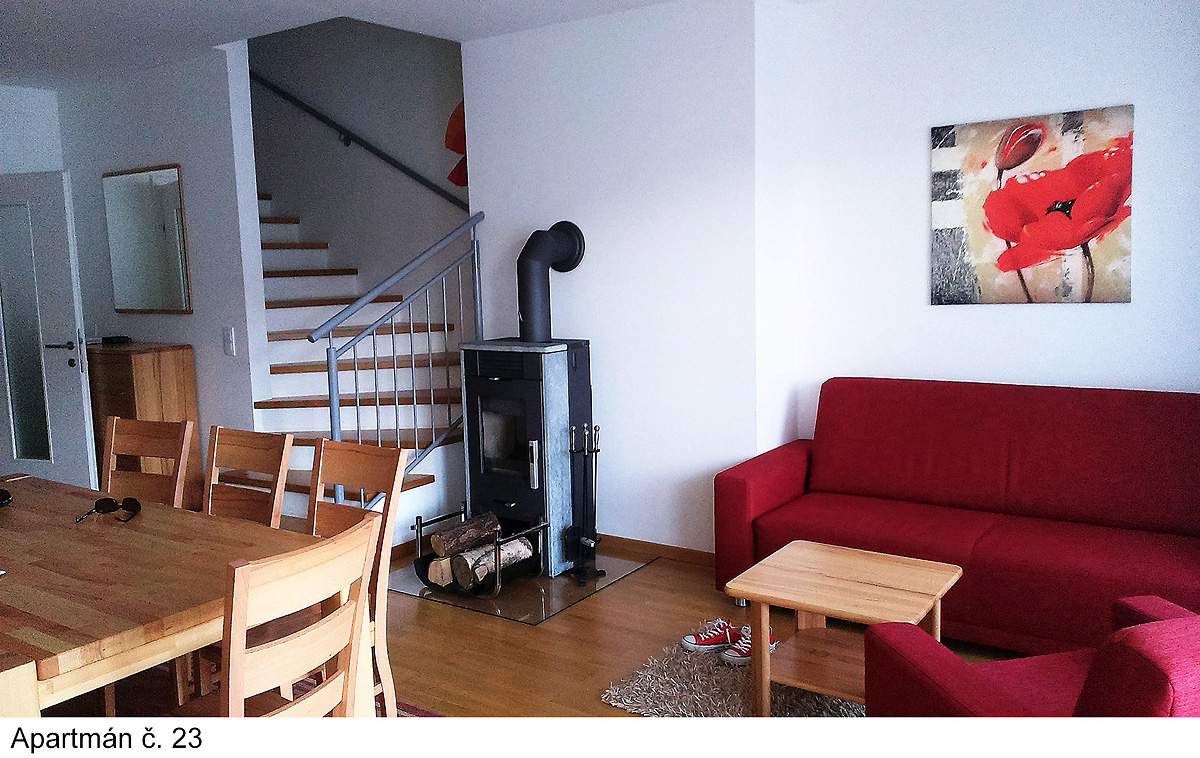 95 m² - 1 podlaží apartmánu: obývací pokoj s kuchyňským koutem a rozkládacím gaučem pro 2 osoby, sociální zařízení, terasa2. podlaží apartmánu: 2 ložnice s manželskou postelí, ložnice se 2 palandami, 3x sociální zařízení (vždy přístupné z ložnice), balkon