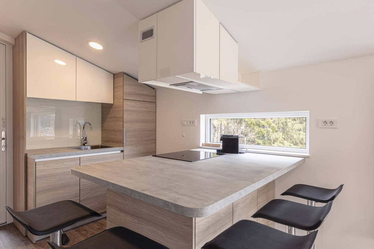 22,5 m² - obývací pokoj s kuchyňským koutem, manželskou postelí a gaučem pro dítě do nedovršených 13 let, sociální zařízení, terasa; obývací část se nachází v 1. patře přístupném pouze po schodech