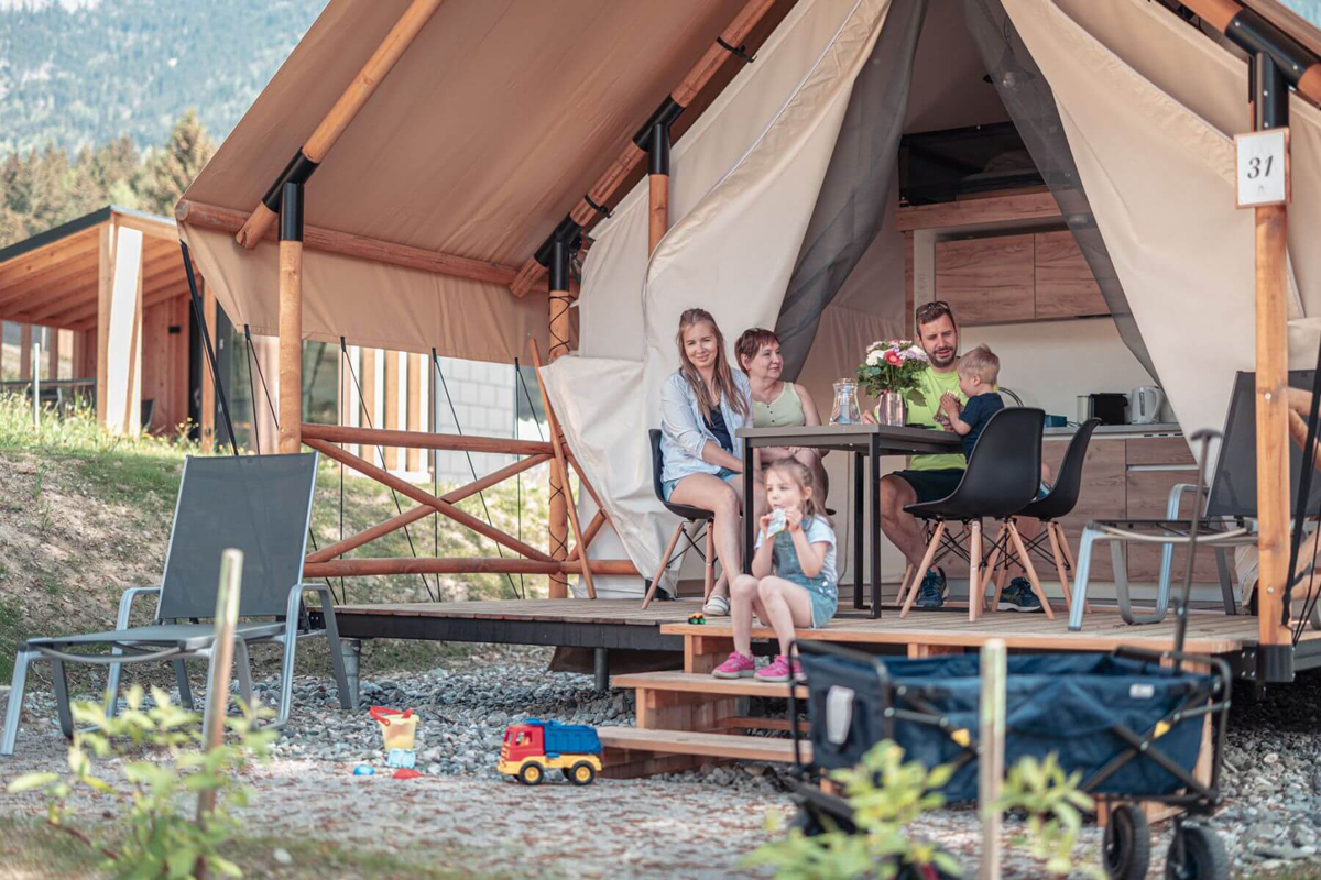 31 m² - luxusní stan se 2 manželskými postelemi (1x dole a 1x v horní části přístupné po žebříku), kuchyňský kout a jídlením stolem, sociální zařízení, terasa