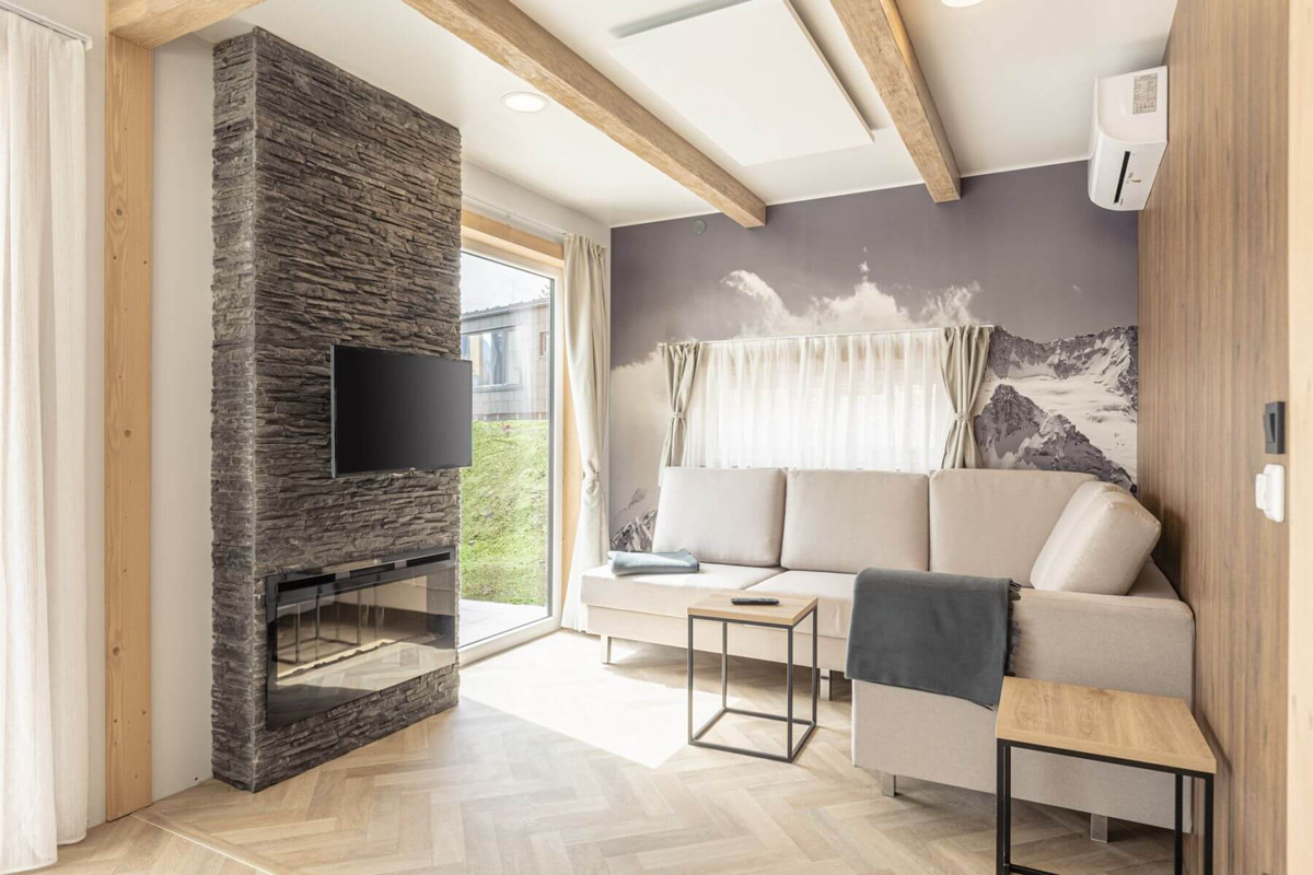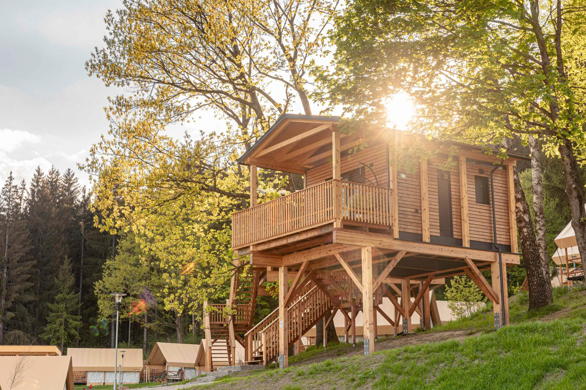 prázdninová vesnička s chalety a luxusními stany se sociálním zařízením přímo ve stanech