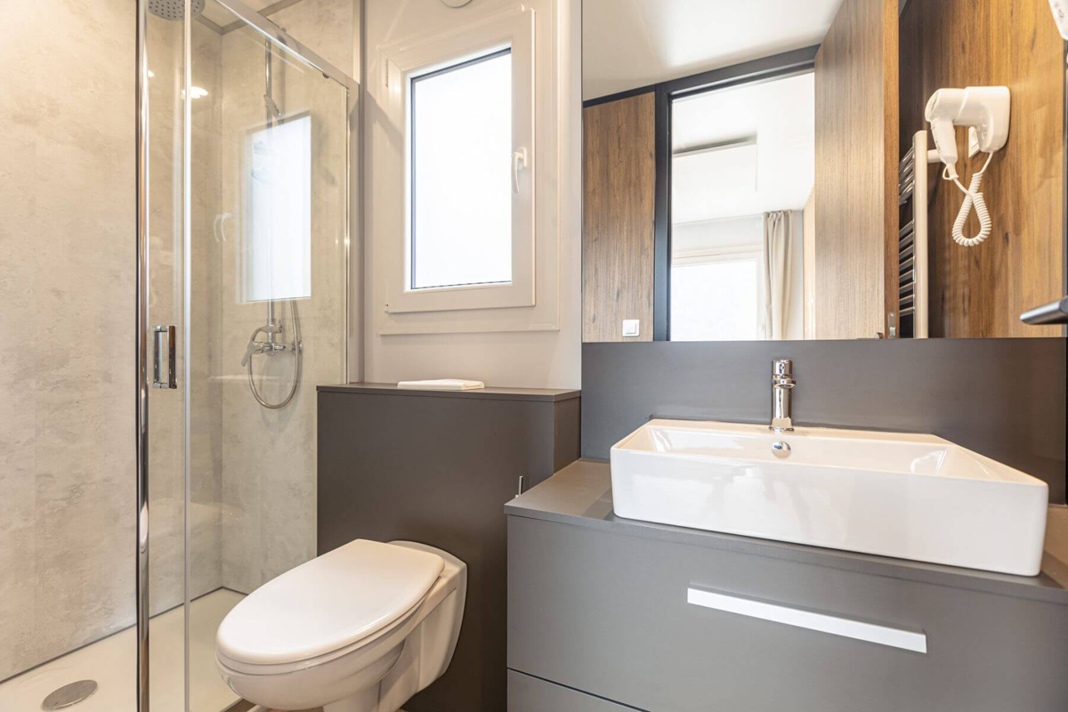 60 m² - 3 ložnice s manželskou postelí či 2 samostatnými lůžky či palandou pro 2 osoby (zpravidla 1x manželská postel, jedna palanda a 1 ložnice se 2 samostatnými lůžky), obývací pokoj s kuchyňským koutem, sociální zařízení, terasa