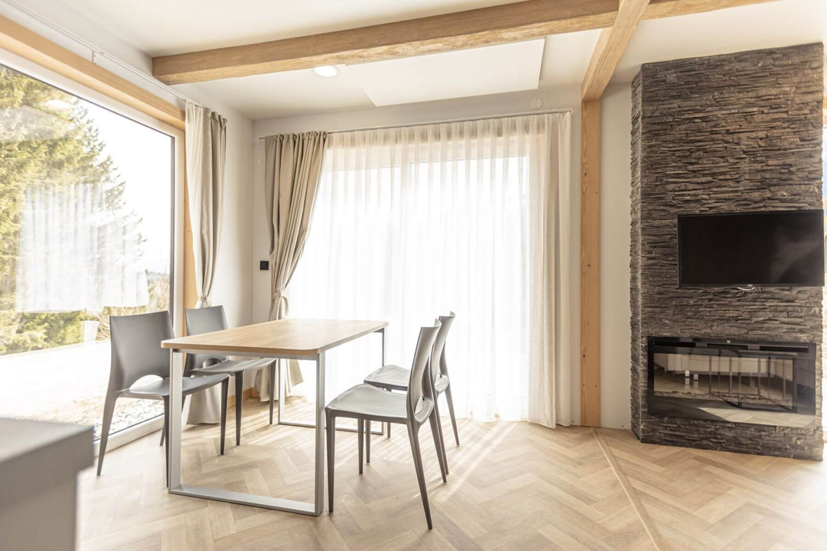 51 m² - 1 ložnice s manželskou postelí, 1 ložnice se 2 samostatnými lůžky, obývací pokoj s kuchyňským koutem, sociální zařízení, terasa