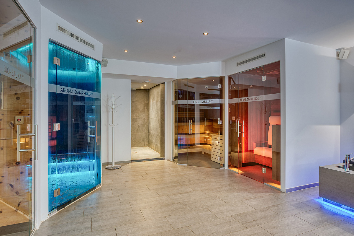bazén 7 x 4,5 m, venkovní sauna, finská sauna, bio sauna, pára, horizontální solárium*, infrakabina, relaxační koutek s lehátky, Kneippův chodník, posilovna, stolní tenis