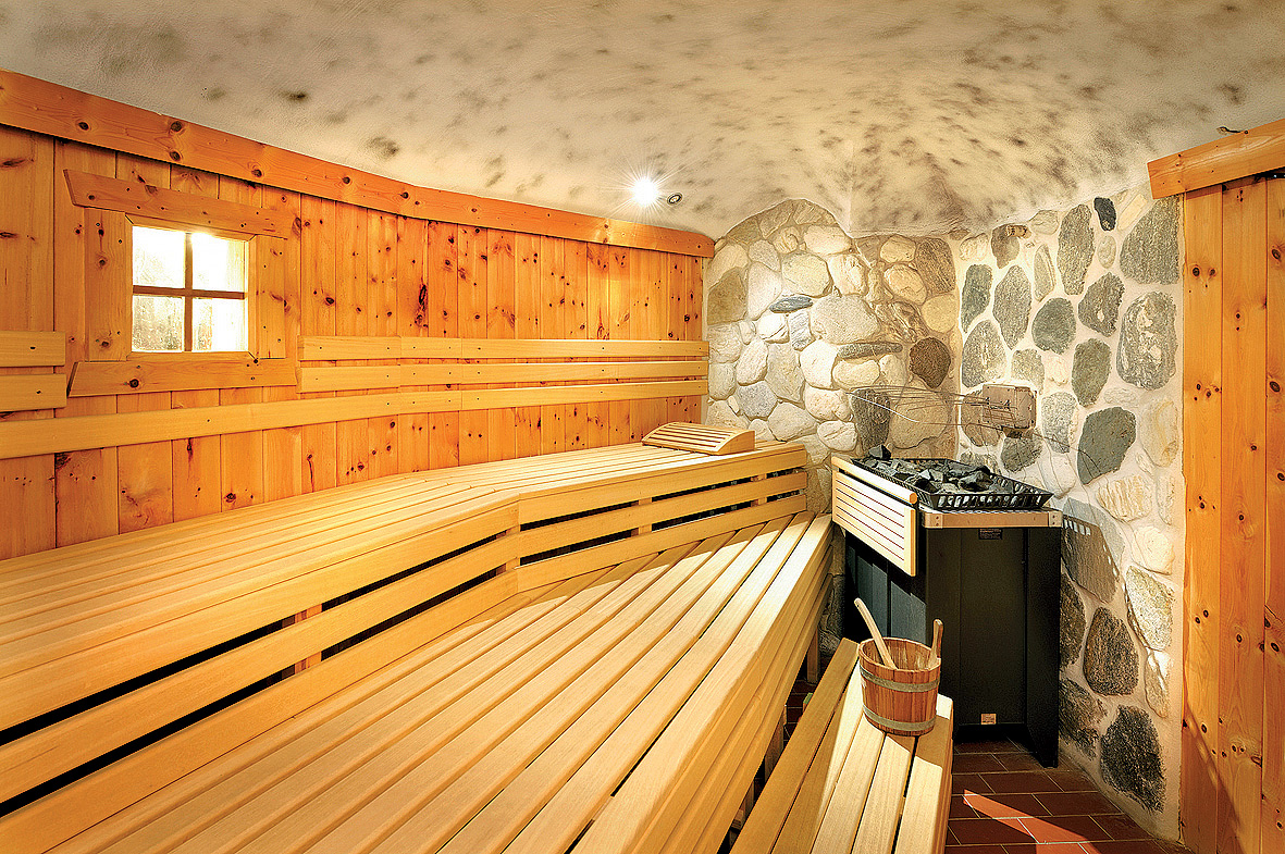 vnitřní a venkovní bazén 72 m² s umělým vodopádem, finská sauna, pára, infrakabina, multifunkční sprcha, relaxační koutek s lehátky; horizontální solárium*, masáže*