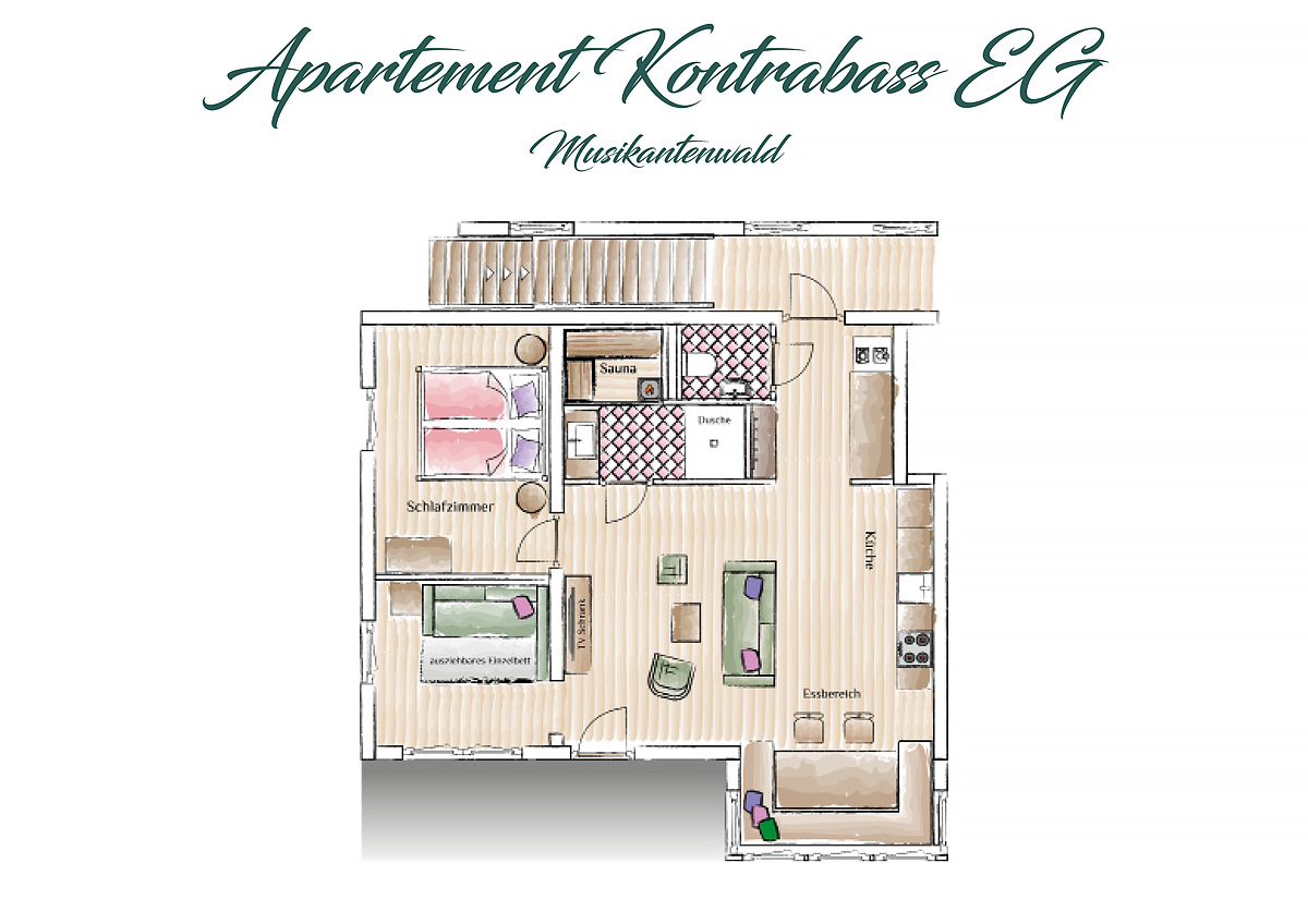 60 m² - ložnice s manželskou postelí, ložnice rozkládacím lůžkem na manželskou postel, obývací pokoj s rozkládacím gaučem pro 2 osoby a kuchyňským koutem, sociální zařízení s privání saunou, oddělené WC, balkon či terasa